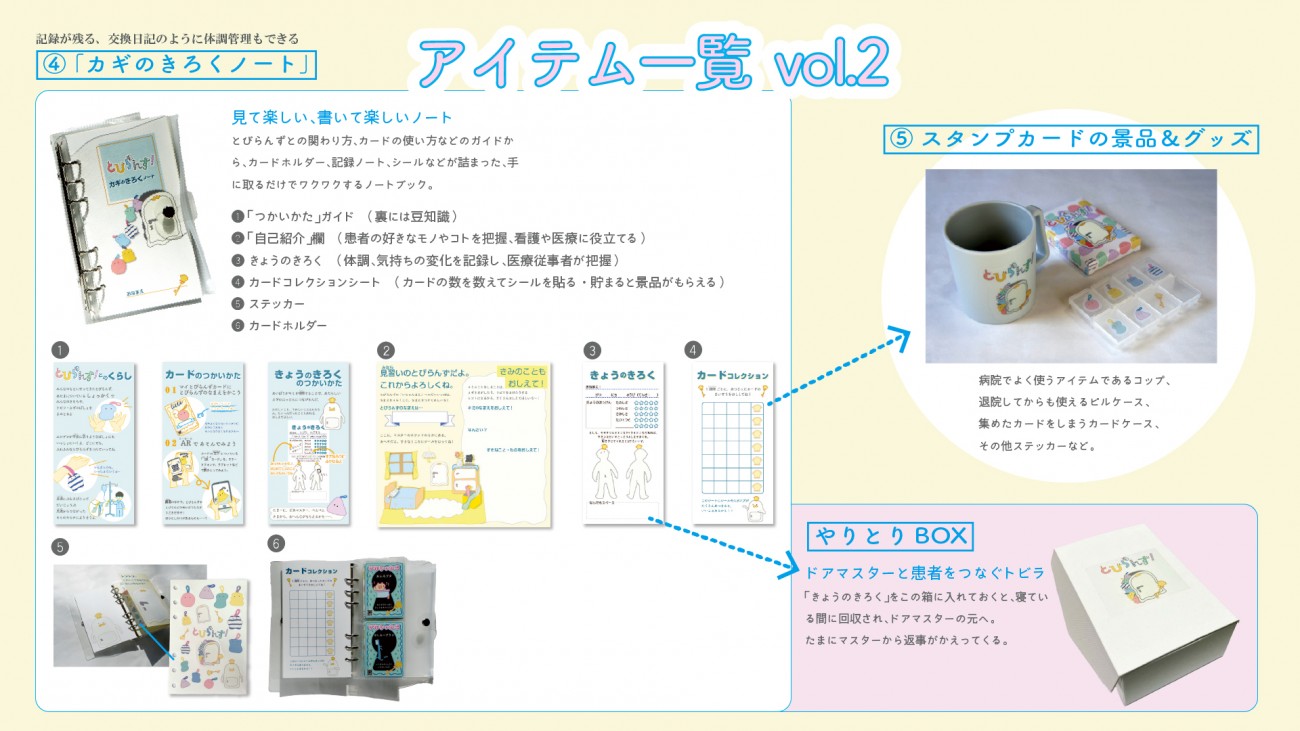 子どもの入院は、大人と比べて理解できることも少なく、不安が大きい。加えて病院によって子供の入院環境はさまざまであり、小児科ではない病棟へ入院する子供もいる。そこで環境に依拠せず、さまざまな場所で汎用性の高い「ホスピタルアート」を考えた。