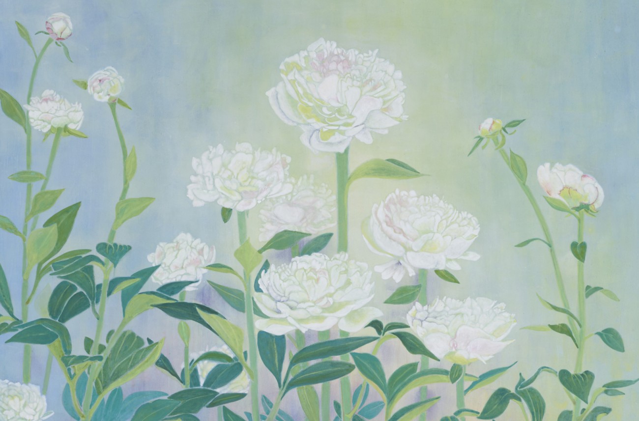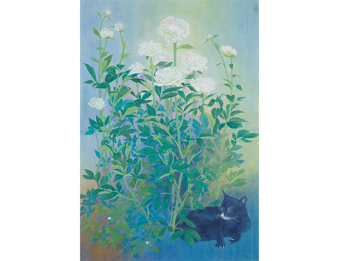 庭の芍薬と家の年老いた猫を描きました。この芍薬は毎年30輪ほどの花を付けます。この年は白い花に少し桃色が入った花が多く開きました。花の大きさは赤ちゃんの顔位、散るときは突然音もなくさらさらと花びらを落とします。葉は勢いがあり力強く艶やかです。猫は家に来てから20年を超えました。静かに老いを迎えています。
