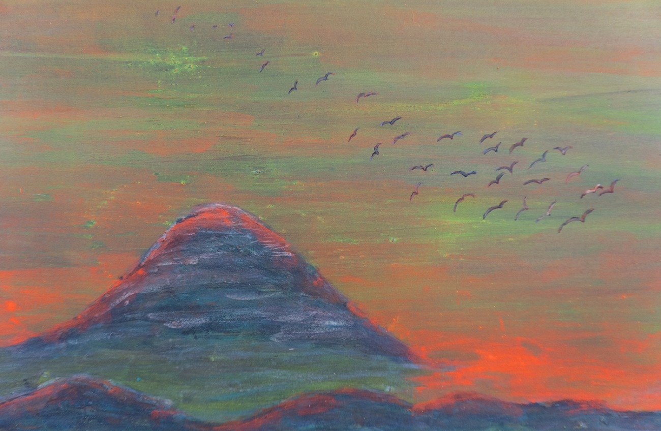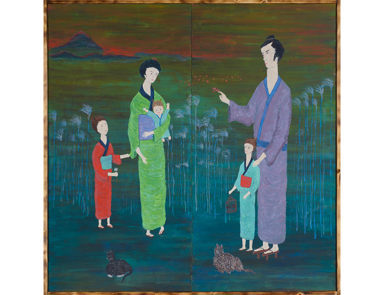 ある日突然に、片親から引き離された子供が、記憶がないであろう赤子の時、みんなから愛され、穏やかな時間があったことを知れるように、小さなプリクラの写真をモチーフにし、時代設定を昔とすることによって、時間軸の広がり、過去の記憶と未来への希望を感じ取れるようにと描いた。江戸の秋。