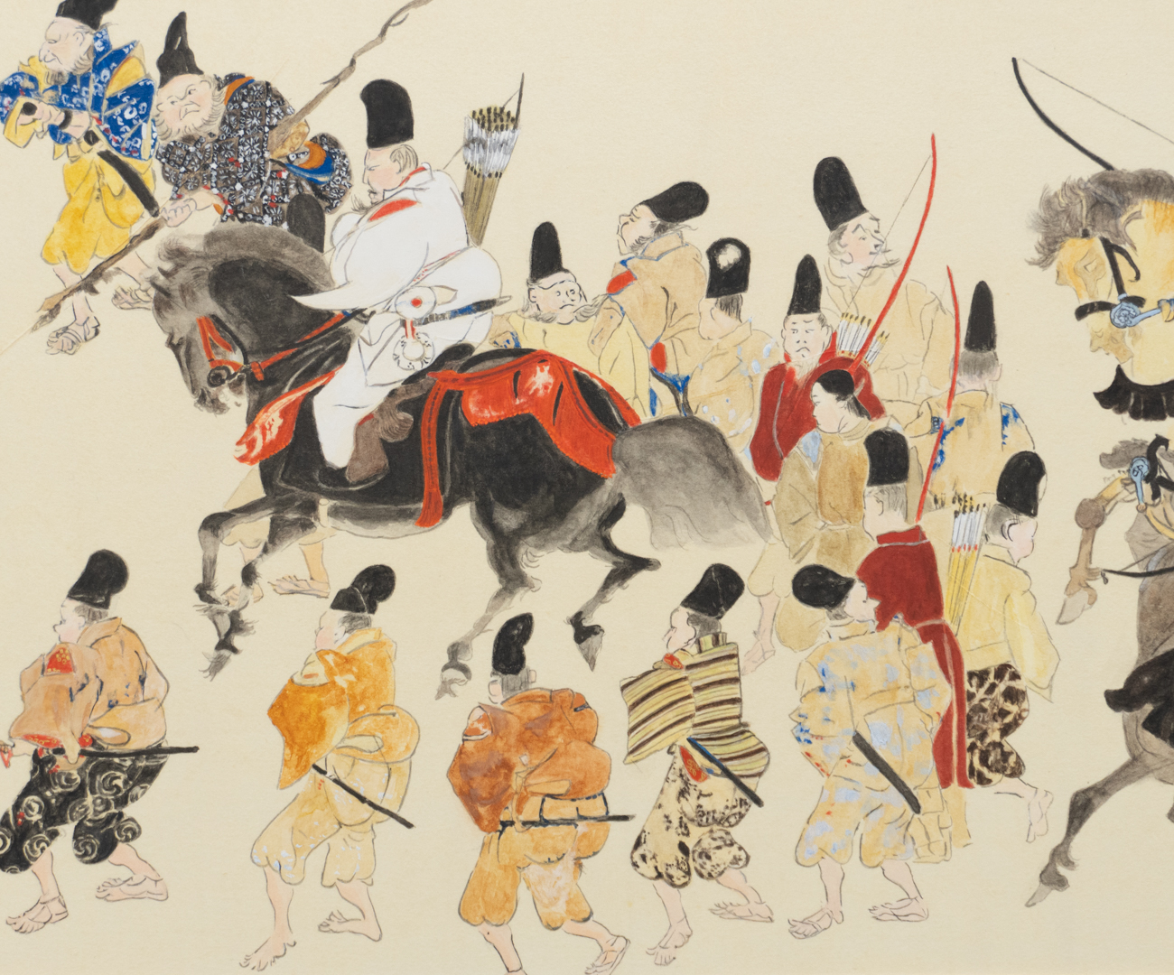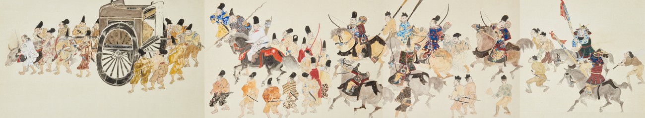 後白河上皇が編纂した伴大納言絵巻のラストシーン、伴大納言が応天門の放火の犯人として捕縛された場面です。866年3月10日に起きた「応天門の変」を基に、連続性と変化に富んだ人間観察や場面描写が特徴です。甲冑の焼群青や緑青と墨の黒や朱、丹の色との色の対比が美しく、上皇が最初に見た時を想像すると国宝に選ばれた意味を感じます。