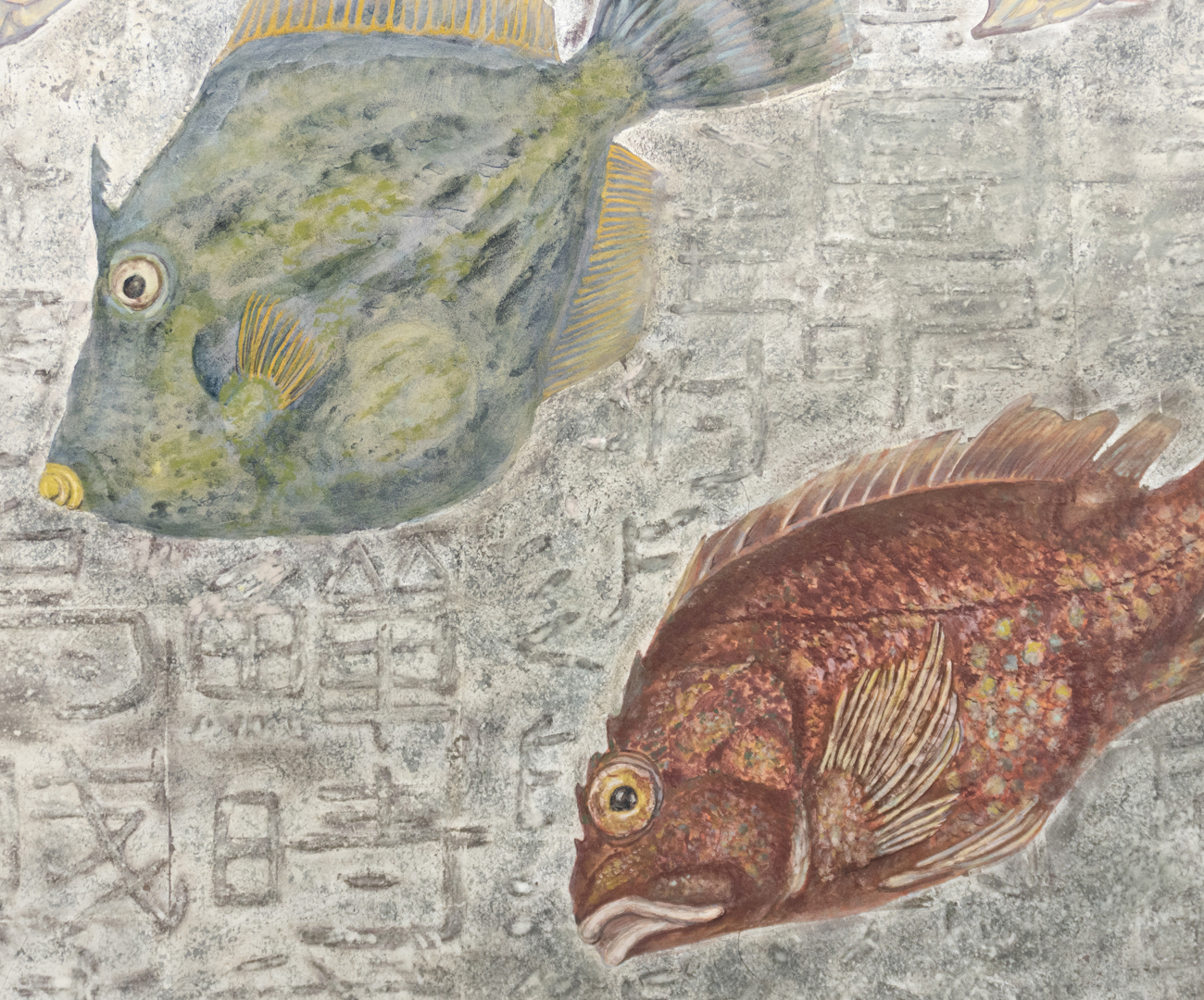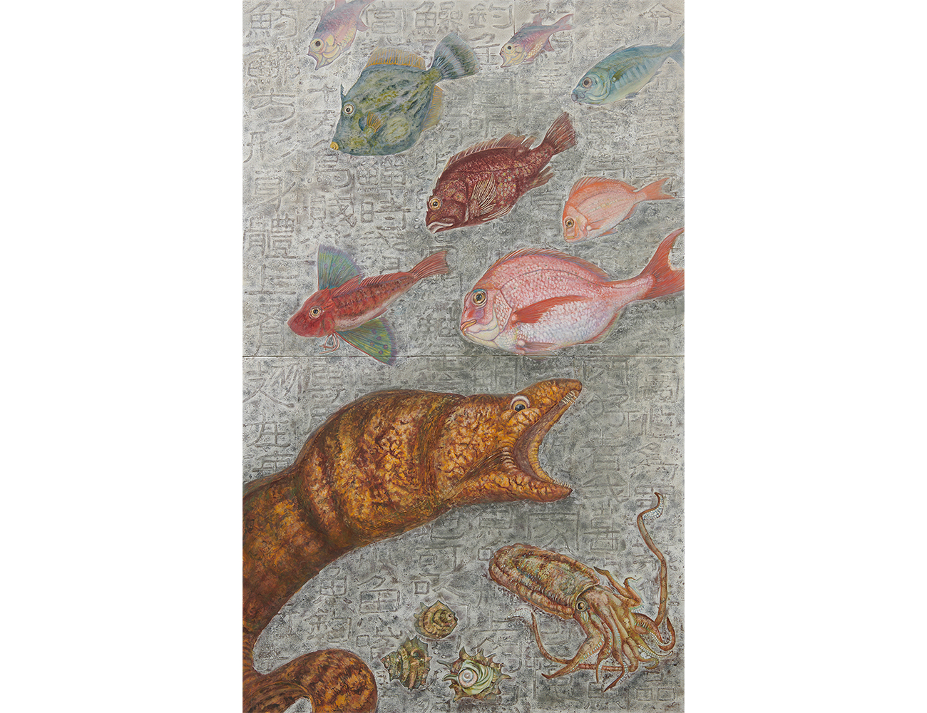 紙本/岩絵具, 水干絵具, 墨, 膠, 銀箔, 金泥, 銀泥, モデリングペースト, ジェルメディウム, 典具帖紙