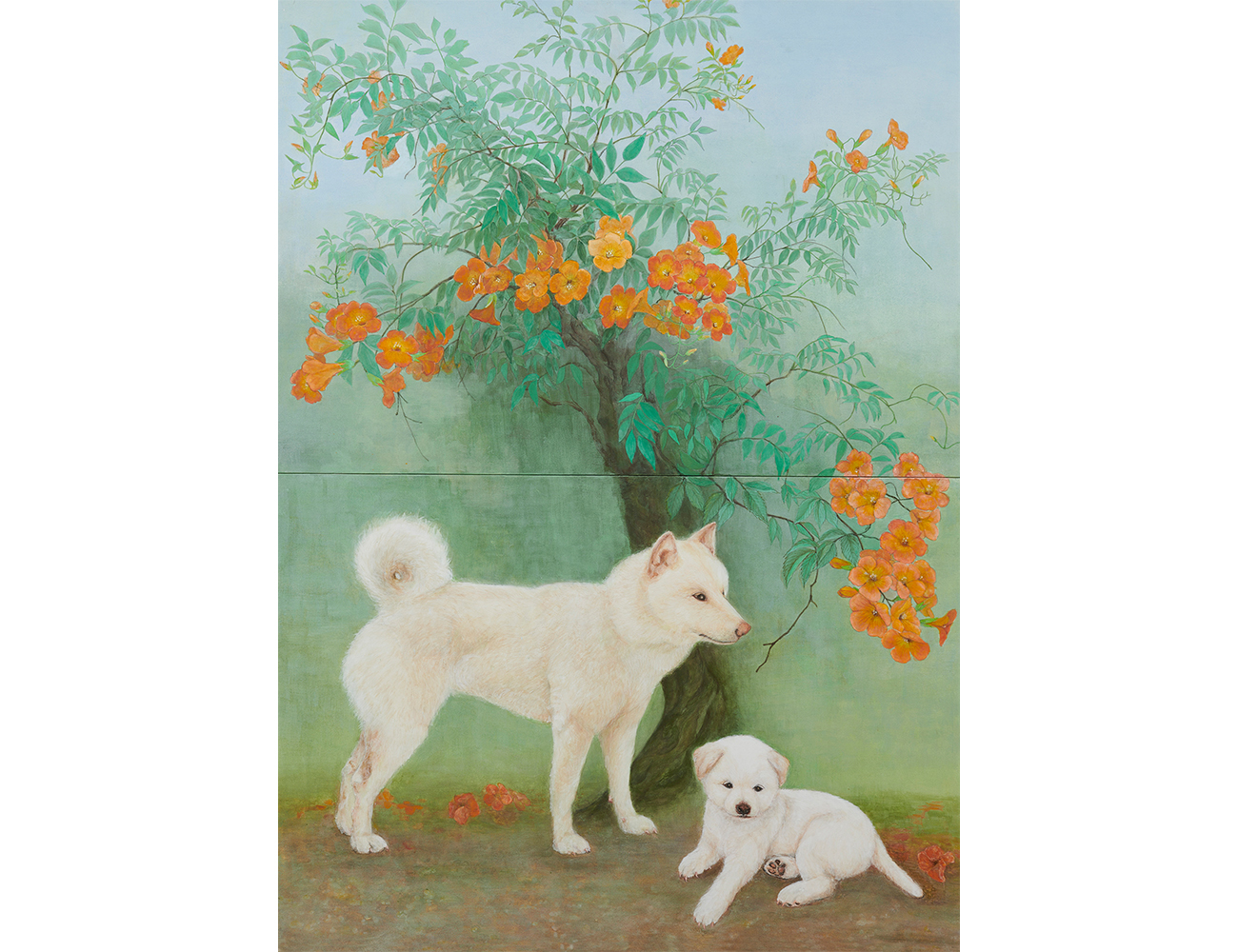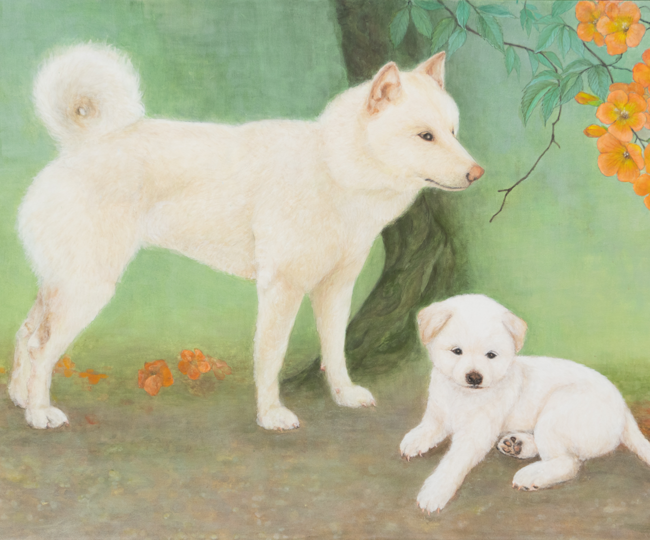 ある夏の日、庭の凌霄花(のうぜんかずら)が青空に映え美しく咲いている傍で、愛犬が仲良く寛いでいる様子を作品にしました。柴犬の堂々とした姿と柔和な眼差し、子犬の愛くるしい表情を描きたいと思い制作しました。この作品で穏やかな夏の午後の雰囲気を感じていただけると幸いです。