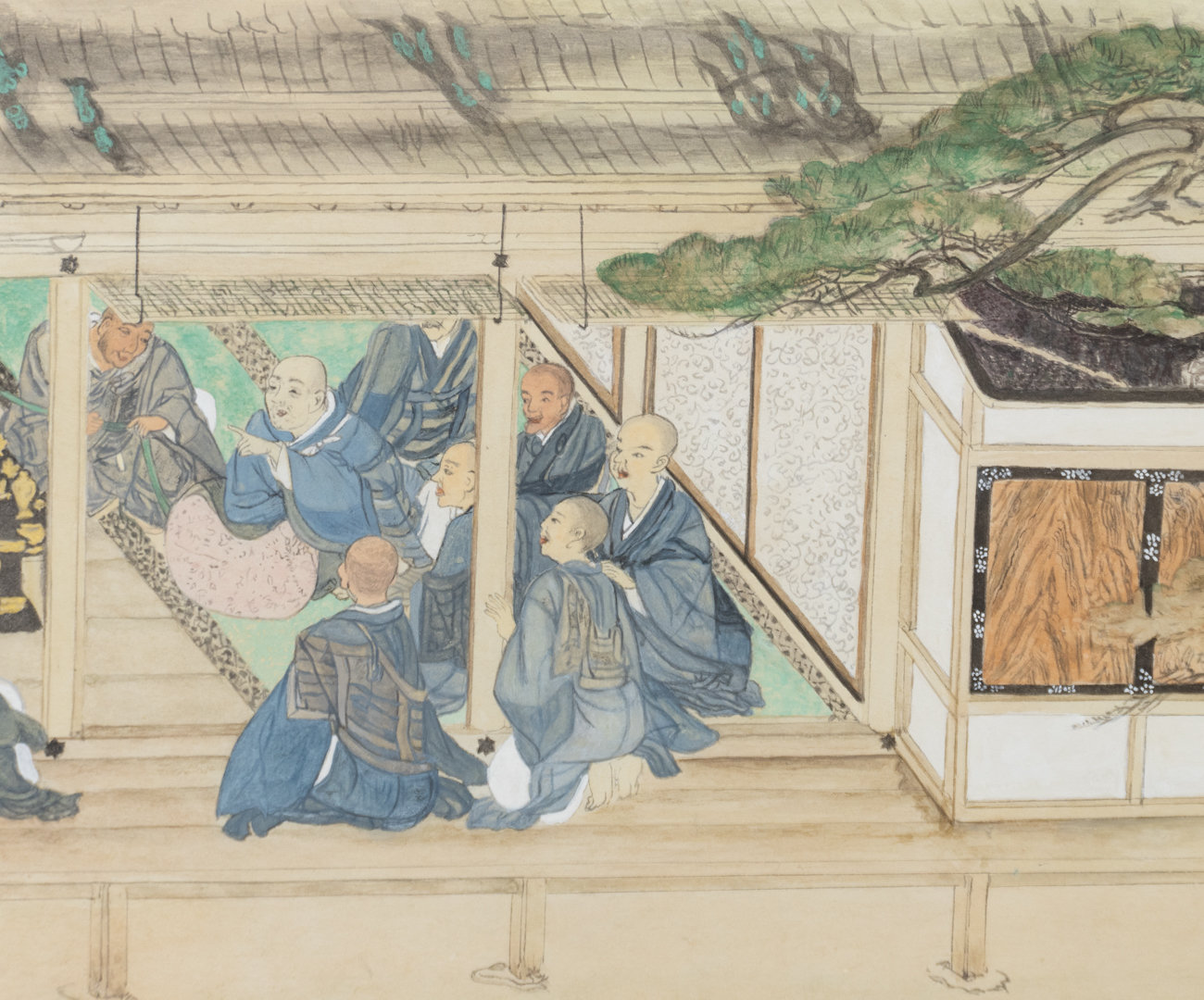 法然上人絵伝は浄土宗開祖法然上人の行状を絵巻にしたものである。絵解きにより浄土宗を民衆に広める為に制作されたと言われている。この場面では、日々念仏に励んだ法然上人の元に、阿弥陀仏が観音と勢至の2菩薩を従えて迎えに来ている姿が描かれている。
