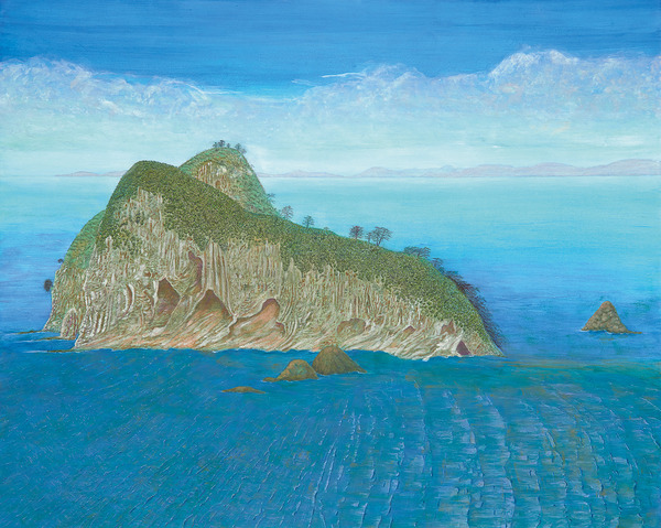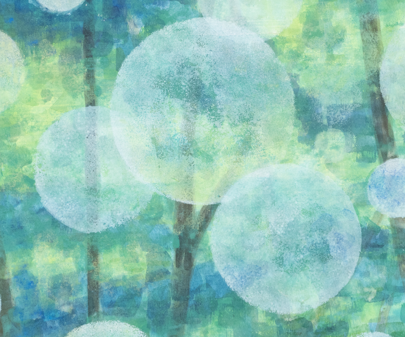新緑の爽やかな風が、木々をすり抜け梢を揺らす。陽光を浴びた葉は、キラキラきらめき、零れ落ちた光は芝生を照らしていた。写生をしていると、風と共に木々の生き生きとしたエネルギーに包まれ、何とも言えない幸福感と深い心の落ち着きを感じた。その時に感じた柔らかな光を思い起こしながら制作に取り組みました。