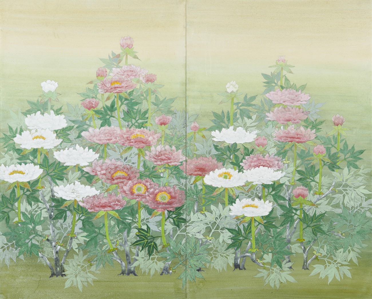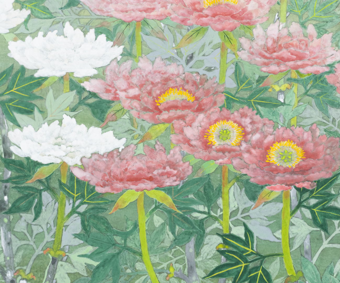 朝早く、近所の牡丹園への写生に行きました。太陽の光と若々しい木の牡丹をスケッチしていると、生きる喜びのような表現をできれば良いなと思い、描きました。