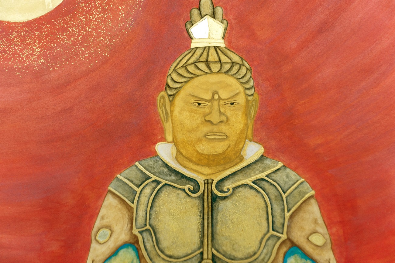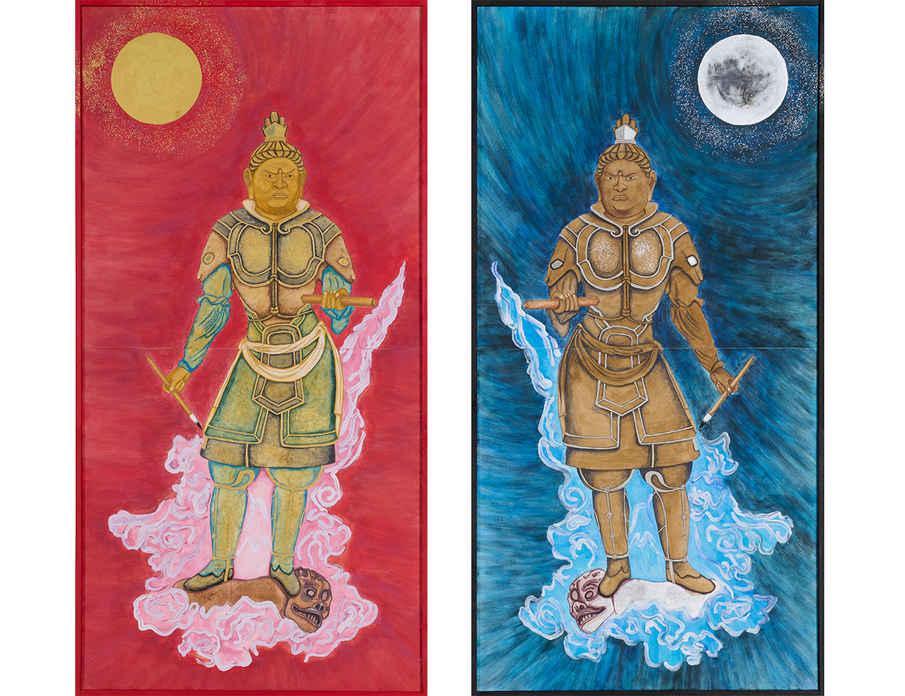 四天王像は、仏の敵を退ける守護神として知られている。2022年7月8日には、元首相が、たった一人の男に銃撃され死亡した事件も起こり、改めて、人の心に潜む、裏の心を見抜く力が問われている。四天王像の1体で広目天像を通して、表の心と、裏の心を、シンメトリックで描く事で、人の心の移り変わりを見抜く力を表わしている。
