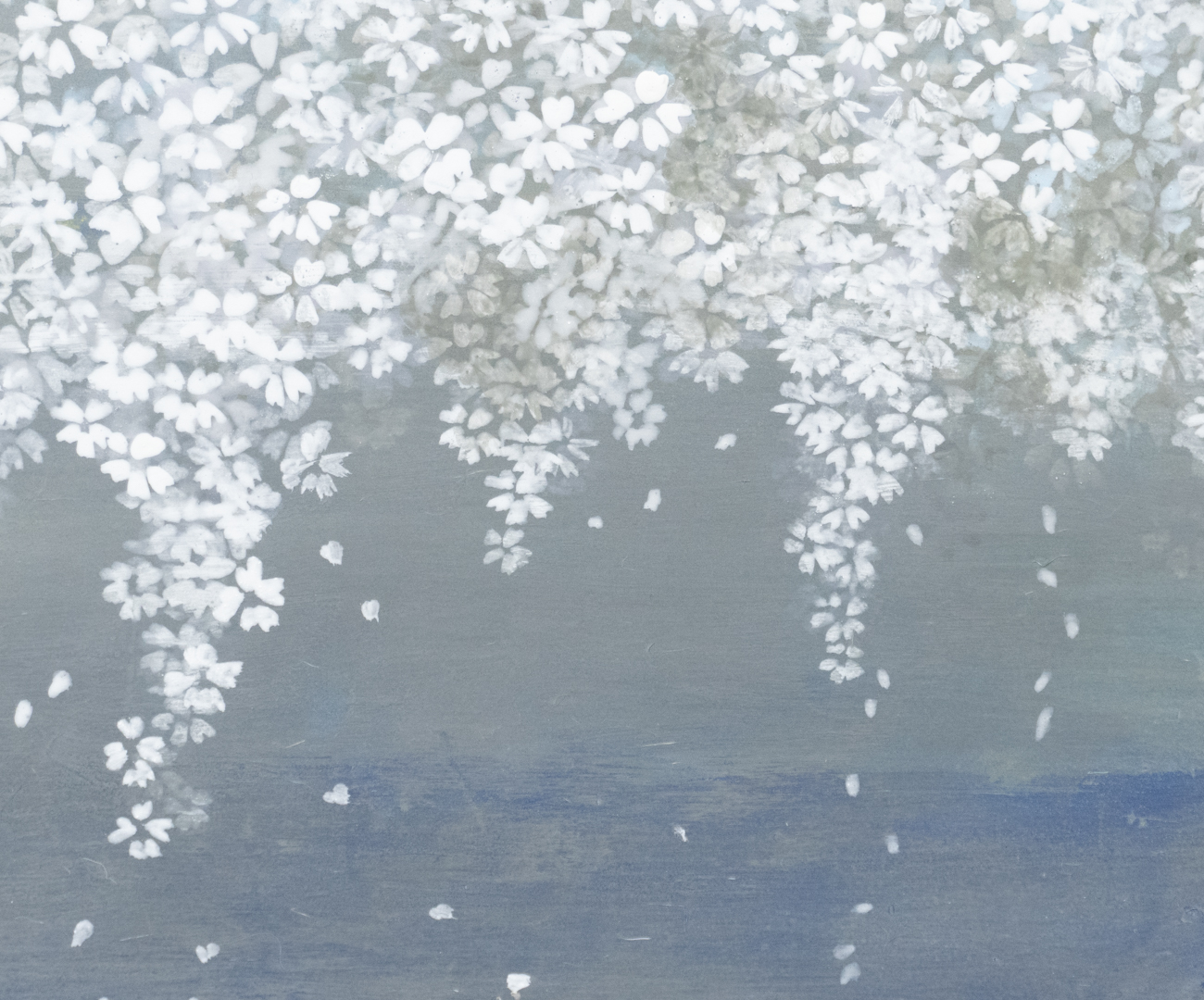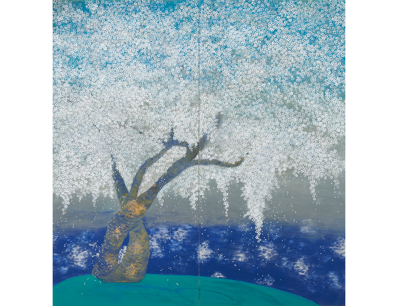 毎日のように見ている名もなき桜の木を描いた。近くの公園の一角に一本だけ静かに咲き誇っている。北陸地方では11月終わり頃から翌年の3月終わり頃まで、枝が折れないように雪吊りがつくられる。雪が降り樹に雪の白い花が咲き、やがて雪が消えていく。その後、蕾が膨らみ桜の花が一気に開花する。心躍るこの風景を何度見ただろうか?