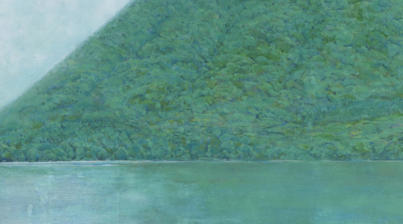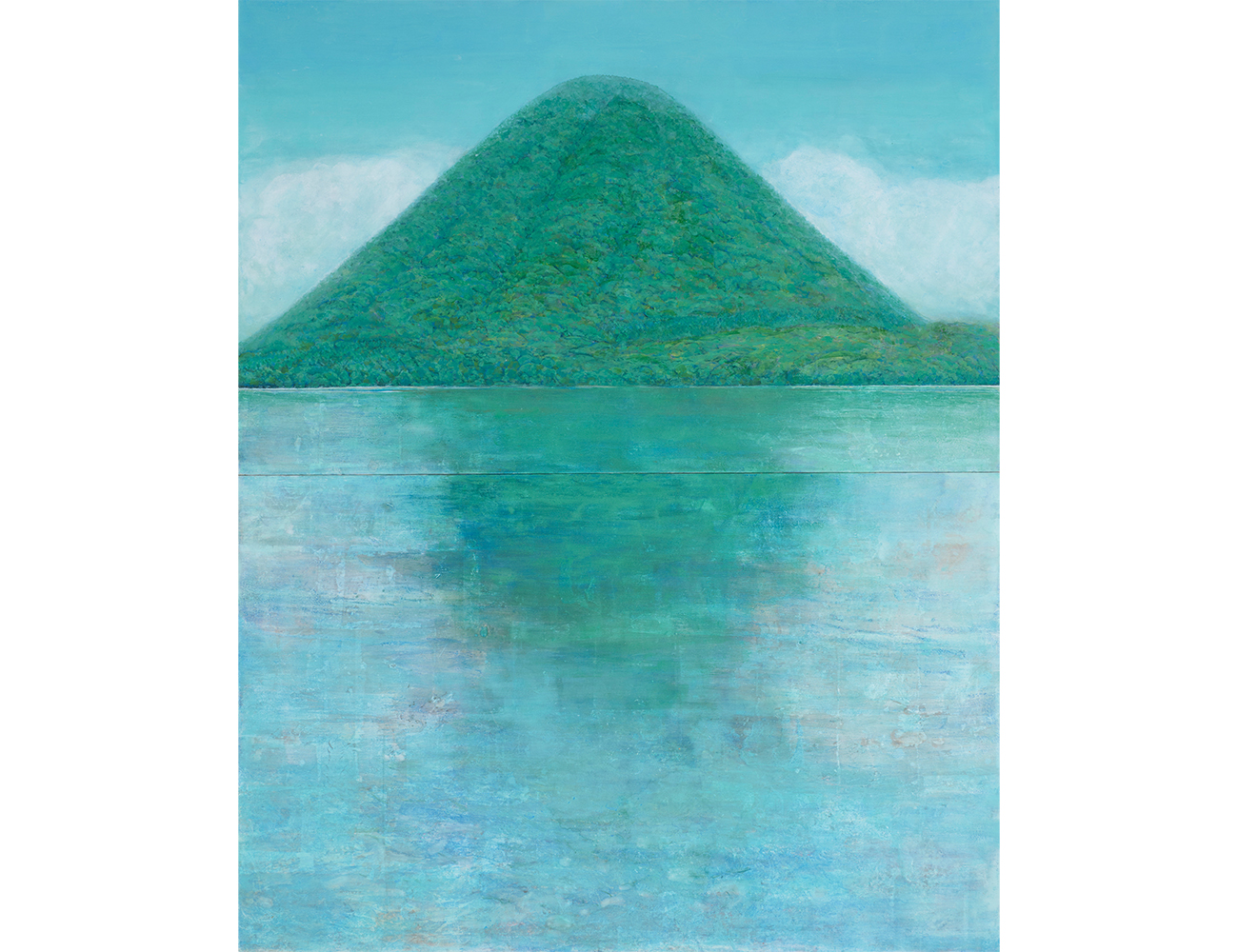 群馬県高崎市の榛名富士を背景にした榛名湖を描いた。何も語らずどっしりと構えるこの風景をじっと見ていると、すーっと風が吹き、息がしやすくなって、頭にも心にもすーっと隙間ができる。この隙間という何もない空間は、「空(くう)のある風景」だからかもしれない。この作品を通して、空(くう)が届くよう願いをこめて描きました。