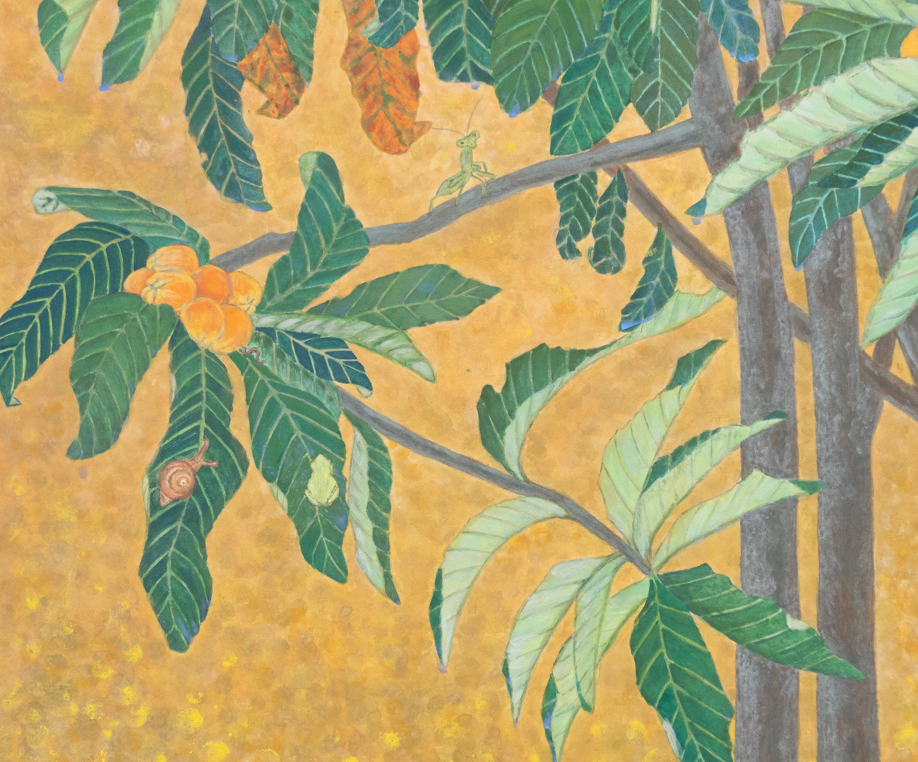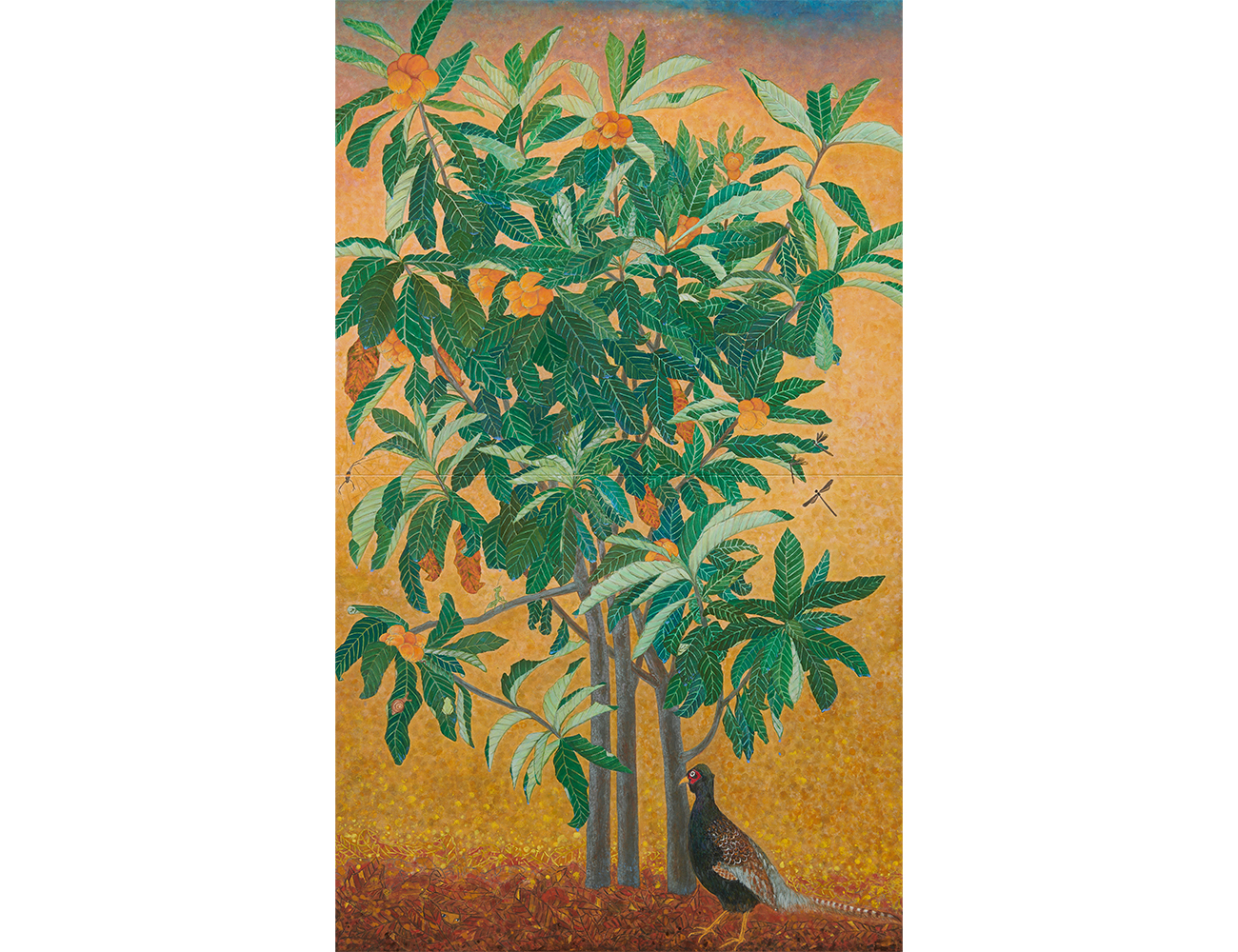 春の終わり、たわわに実をつけた枇杷の木は、朝日をはね返すように空に枝を伸ばす。そして風のある日、過去にこだわらぬとでも言うように古葉をバッサリと落としてしまう。一本に見えるこの木は三本の木からなり、まるで三尊仏のようである。そして、そこに集まる小さな者たちに枝を差し出し、しばしの休息を促す。まるで命を慈しむように。