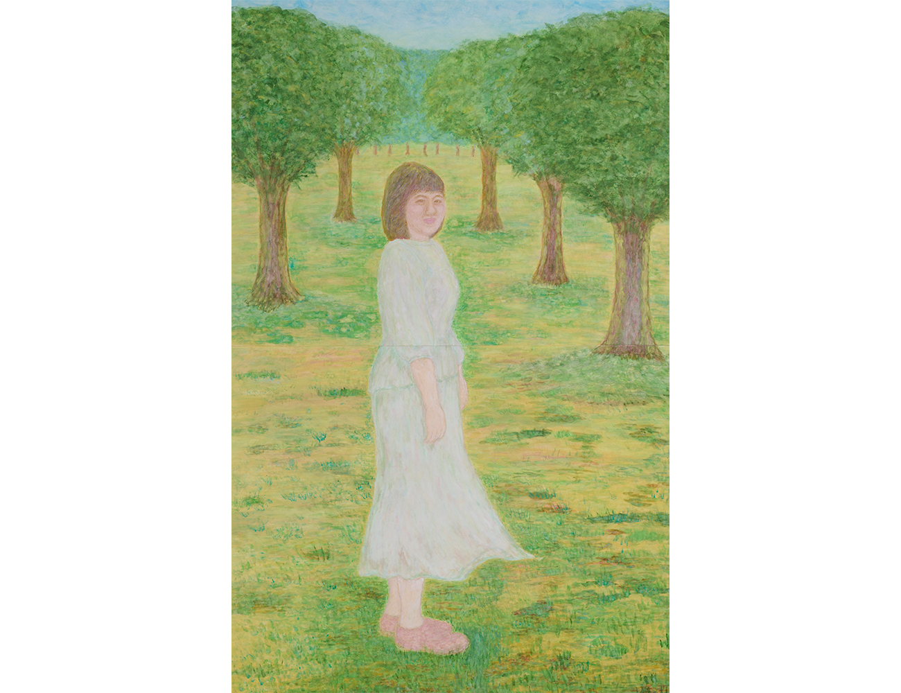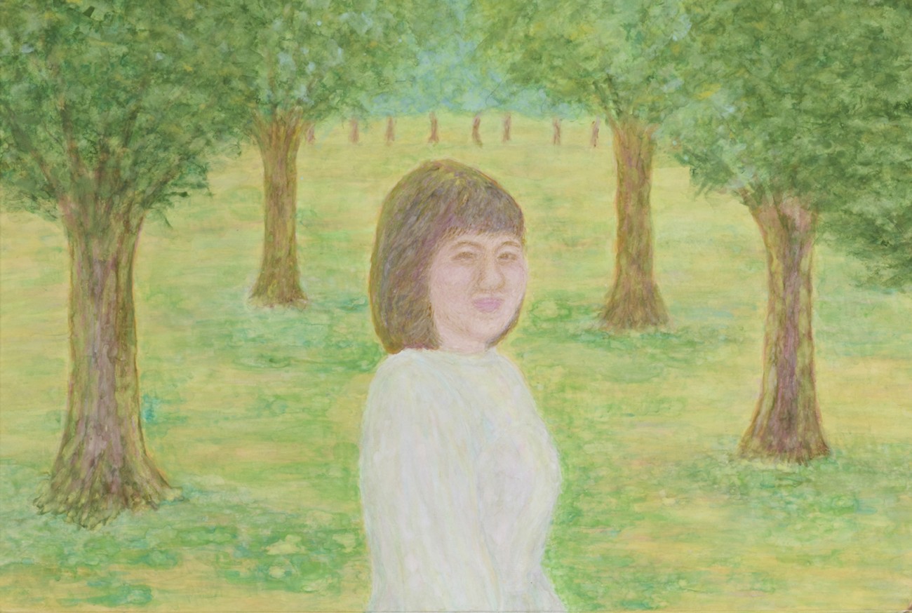 自然の中にいる娘を描いてみました。そよ風が吹いて日差しも心地良い感じが出ればと思いました。いろいろ大変な時期ですが、いい日が続き、幸せな時がずっと続けばいいとの思いを込めて描きました。