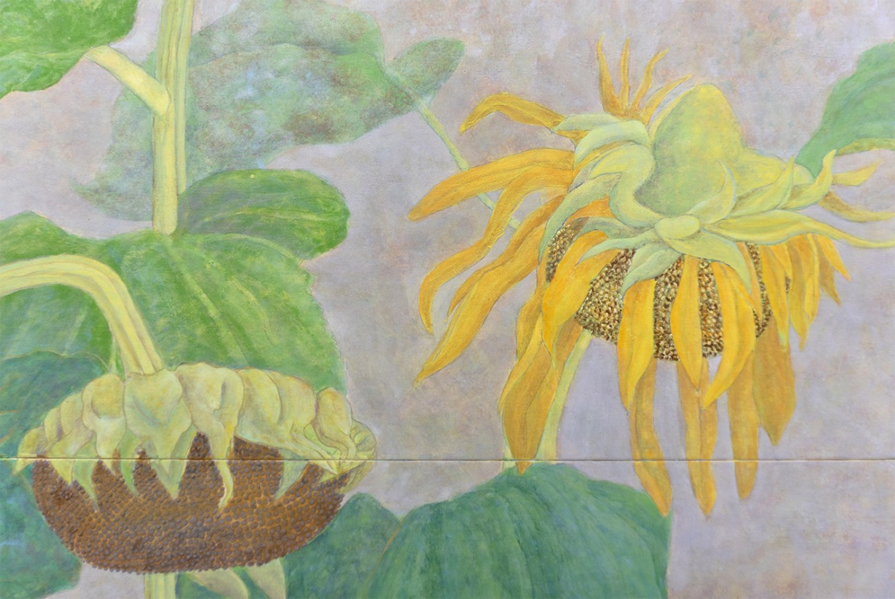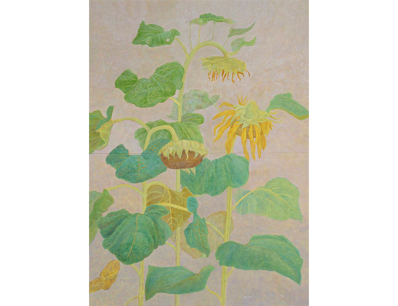夏、私の肌をジッと焼きつける太陽を見つめ咲いている向日葵を見つけた。頭を垂れた向日葵は儚く朽ちていく段階だが、 葉と茎は力強く立っていた。土壌、茎、重力、日光を欲する葉の力で支え合い生きる向日葵達。人は一人では生きられない。向日葵を見て思い浮かんだ何かは観た人の分だけの向日葵が存在する。そして背景も広がって行く。