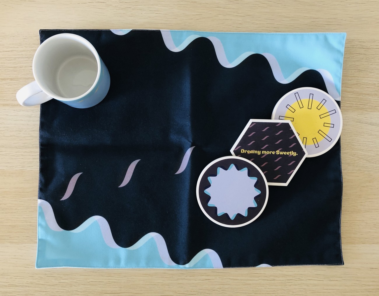 今回の制作物は、味気ないルーチンで完結している生活から抜け出して新鮮な生活を可能にする生活雑貨です。そのため、ランチョンマットやマグカップなどのバリエーションで構成される食事のシーンの生活雑貨を複数のシリーズで展開することに決めました。