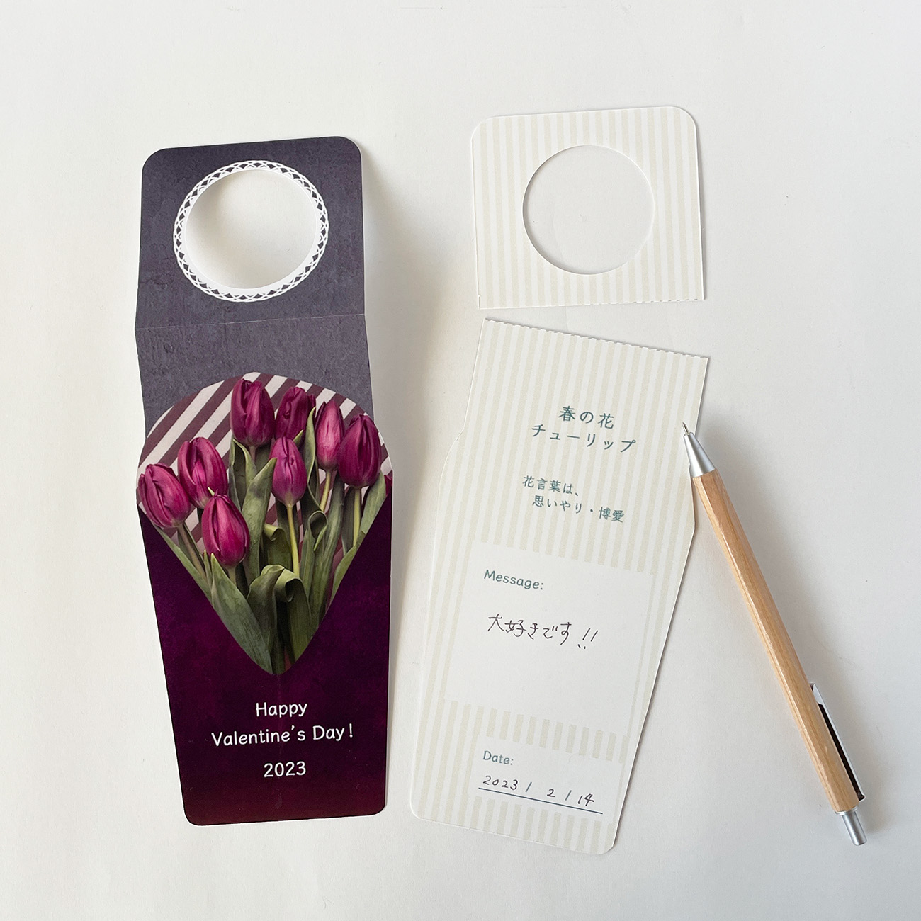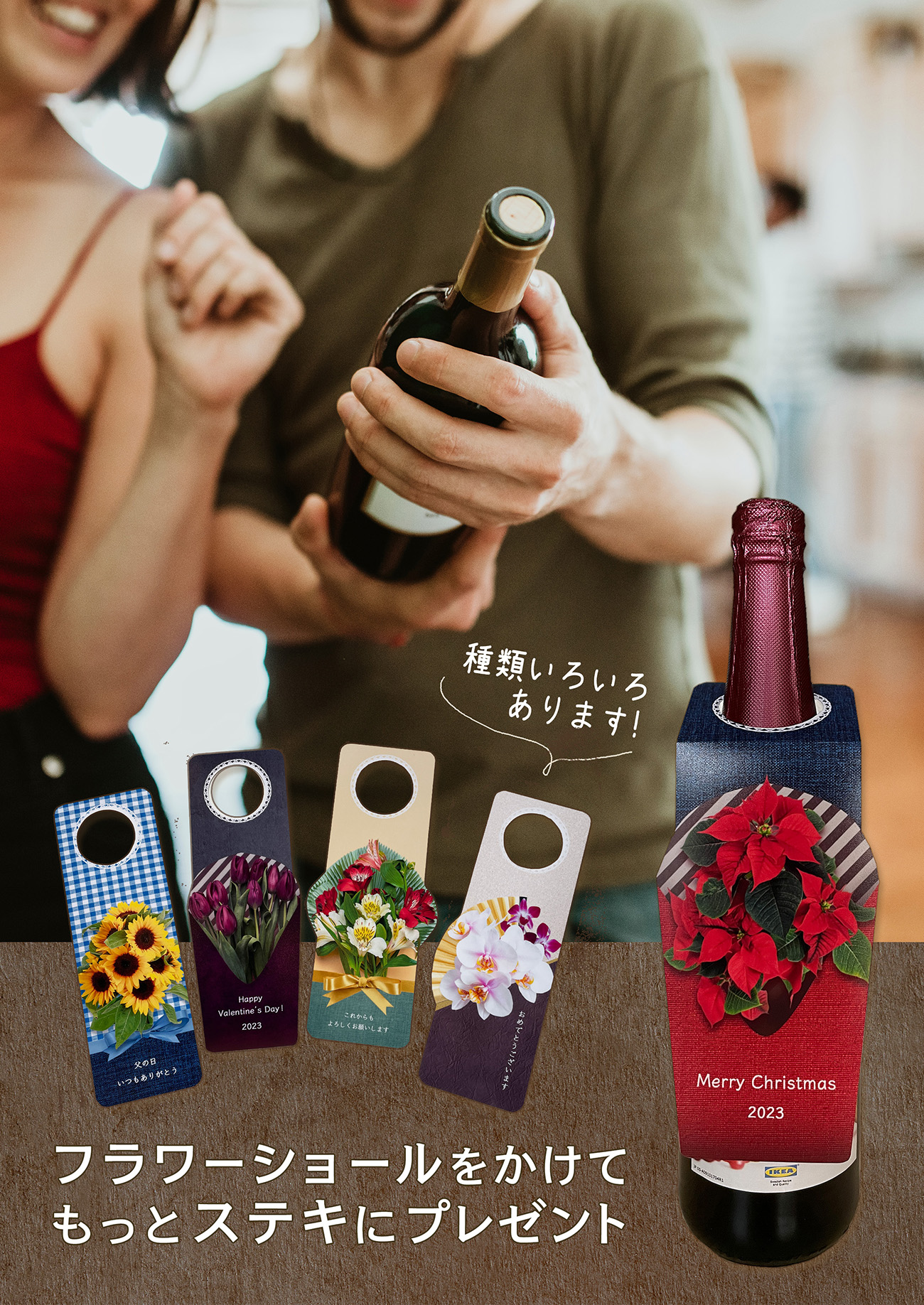 ワインボトルをそのまま渡すのは簡素な印象になってしまいますが、箱に入れ包装すると堅苦しい印象となります。その中間で、ちょっとしたパーティーなどのシーンでお酒などのボトルをプレゼントする人が使えるアイテムを想定しました。また、言葉にするのが恥ずかしい人が、贈る相手に気持ちを伝えやすいメッセージ性の高い要素を取り入れたいと考えました。