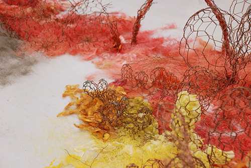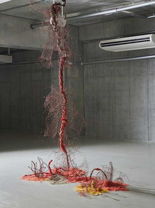 銅線と蚕糸を組合せ、傷んだ皮膚とその皮膚からにじみ出る血流を表現しました。