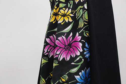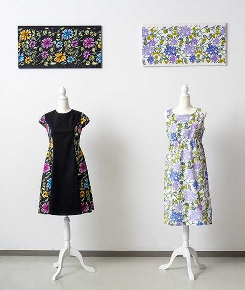 以前より手作りが大好きでいろいろ作って来ましたがその集大成として自分で染めた生地で洋服を作る事にしました。技法はより手触り感のある型染に決め反応染料を使用し前半は白地、後半は黒地の2点のワンピースとそれぞれの布地のパネル作品を制作しました。制作は思った以上に時間と労力ががかかり、真夏の猛暑や自身の体調や体力との闘いでもありましたが先生方のご指導のもと、また多くの仲間たちの励ましに力を得てなんとか完成まで来られ、はるか昔に夢見た「私のワンピース」が実現しました。