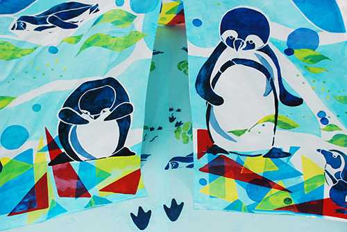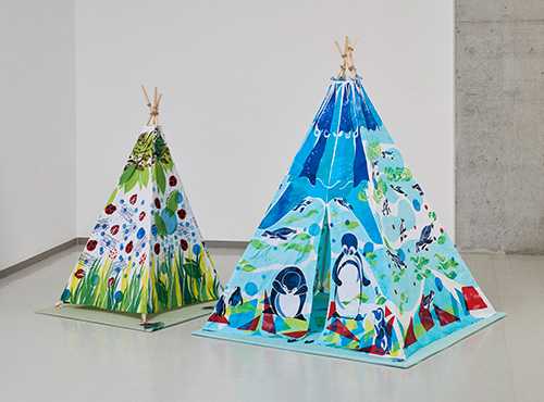 コンセプトは、子どもも大人もわくわくをテーマに制作しました。配置や組み合わせを変えながら数種類の型を使っています。テントの形になっているので内側からも外からの光で透けた絵柄が見えます。キャラクターやそれらが集まっている世界観、中から上を見上げたときに見える面の組み合わせの面白さ、水の中や森の中にいるような包まれた感覚も楽しむことができたと思い、制作しました。