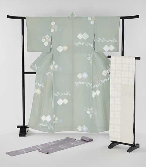 草花や蝶などを単純化した形を縫い絞りしたり、水田を抽象化した線を板締めにしたりして表現しました。布は絹で、これは草木染めの繊細な色合いを引き出してくれる魅力的な素材でした。
