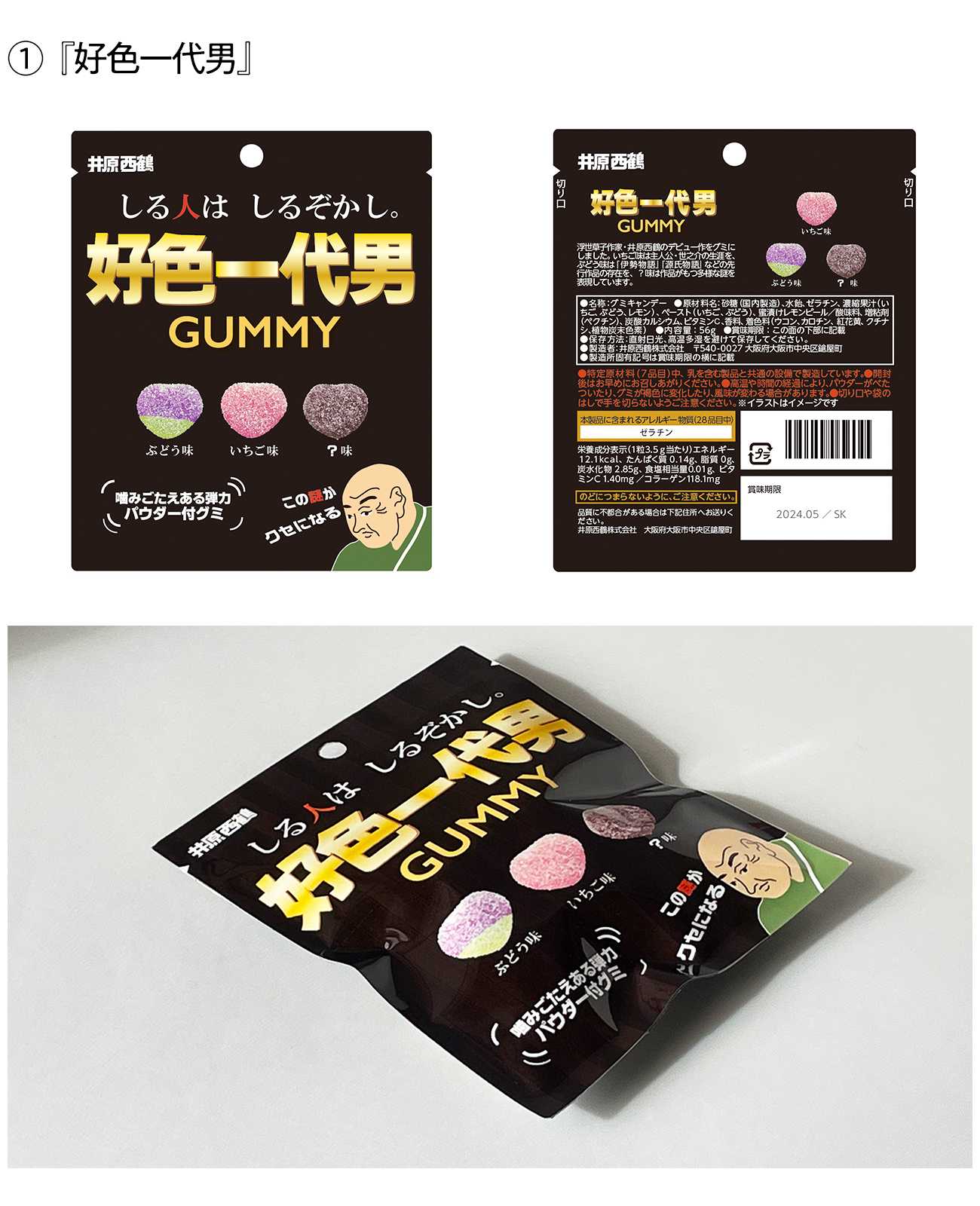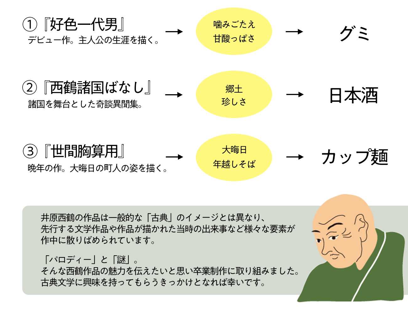 西鶴のデビュー作『好色一代男』をグミに。諸国を舞台にした奇談異聞集『西鶴諸国ばなし』を日本酒に。西鶴晩年の作であり、大晦日の町人の姿を描いた『世間胸算用』を即席カップ麺に。西鶴作品のおもしろさを現代の商品に置き換え、パッケージで表現しました。