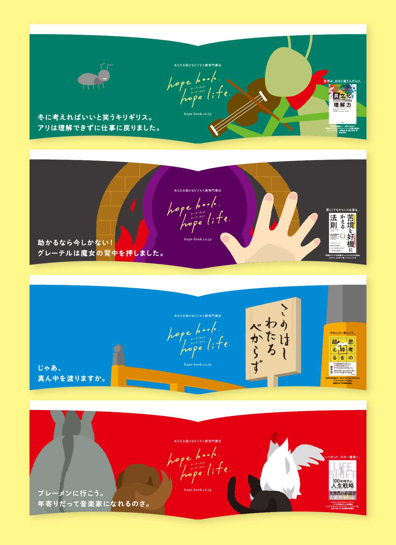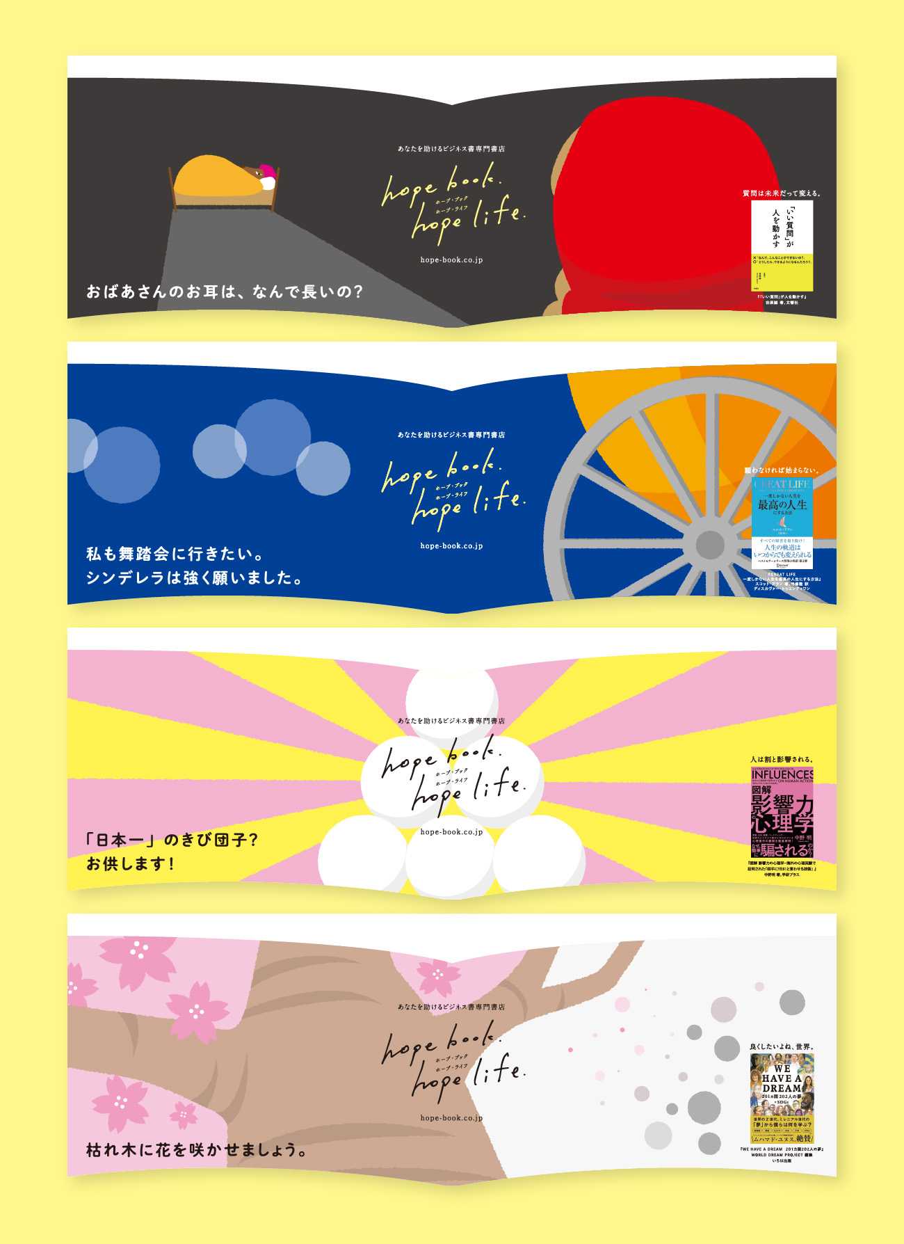 おとぎ話を題材にした車内吊り広告を中心に、共感を呼ぶコピーのポスターを展開。電車1両丸ごと「hope book. hope life.」の世界観に染め上げました。