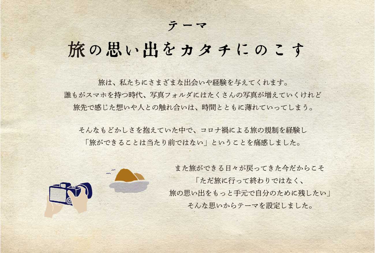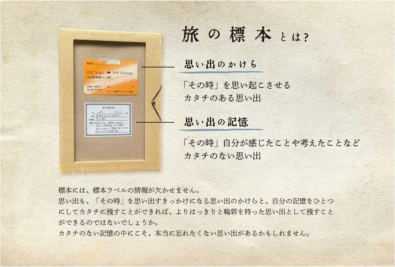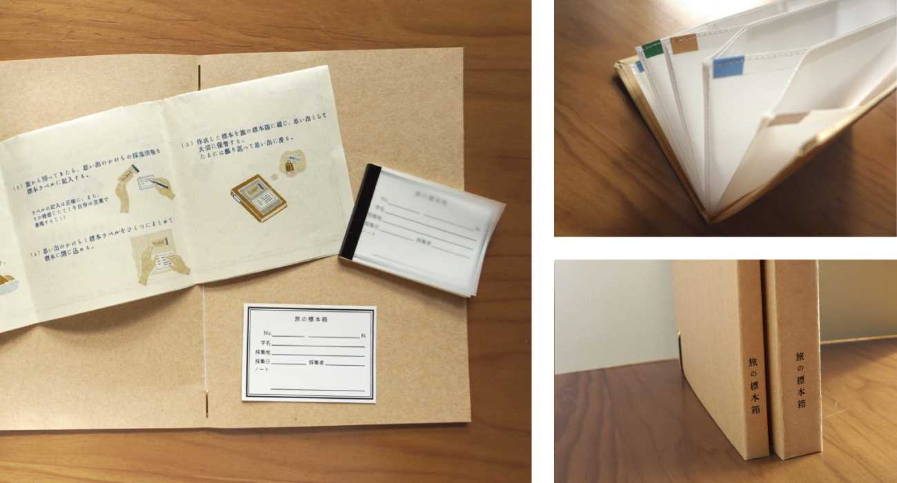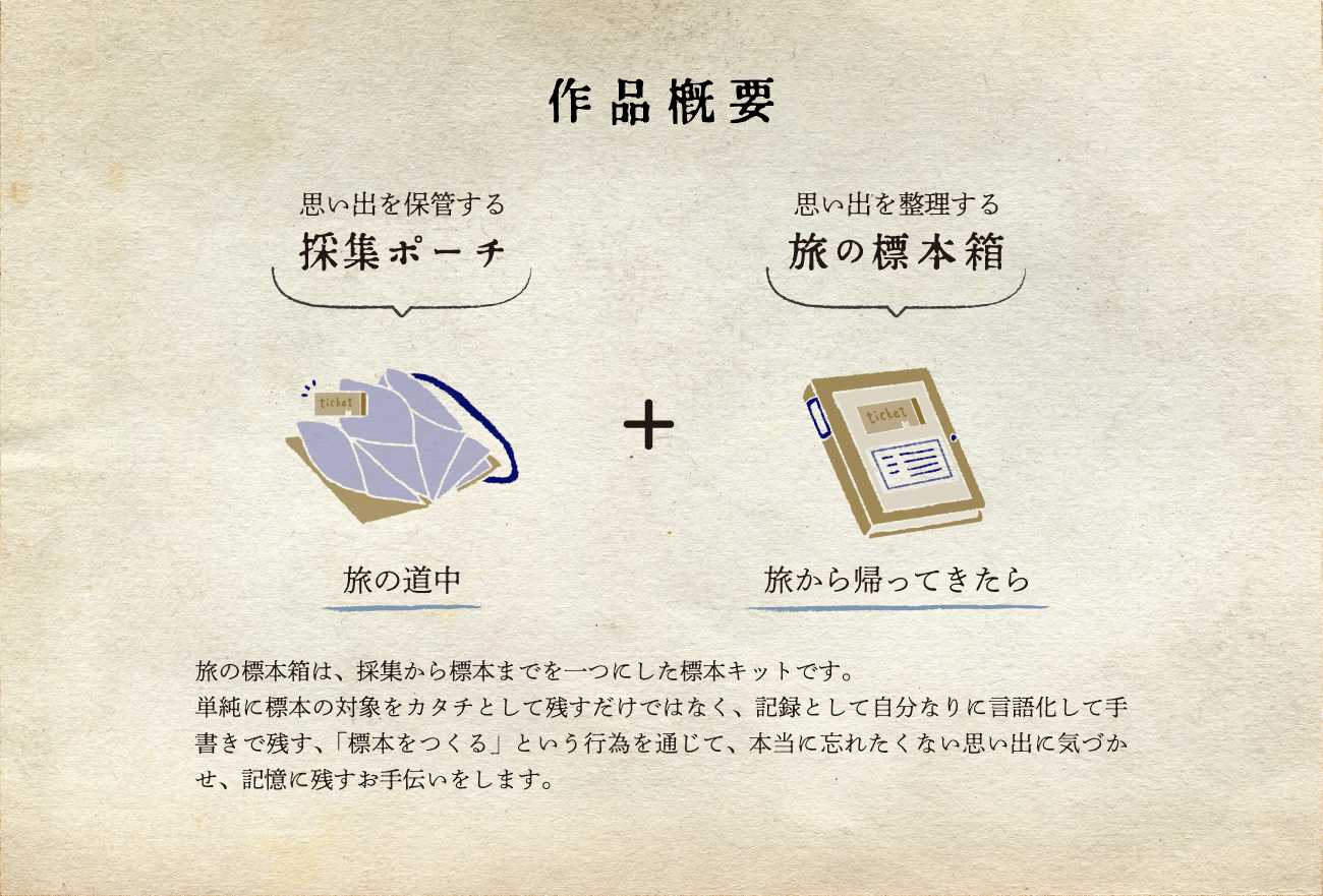 ひとつとして同じものはない旅の思い出を、もっと手元で自分のためにカタチに残したい。そんな思いから、旅先で出会った思い出を標本のように記録して保存することのできる、思い出のカタチに縛られないアルバム作成ツールのプロダクトデザインを行いました。このツールを使うことで、本当に忘れたくない思い出にきっと気付くことができます。