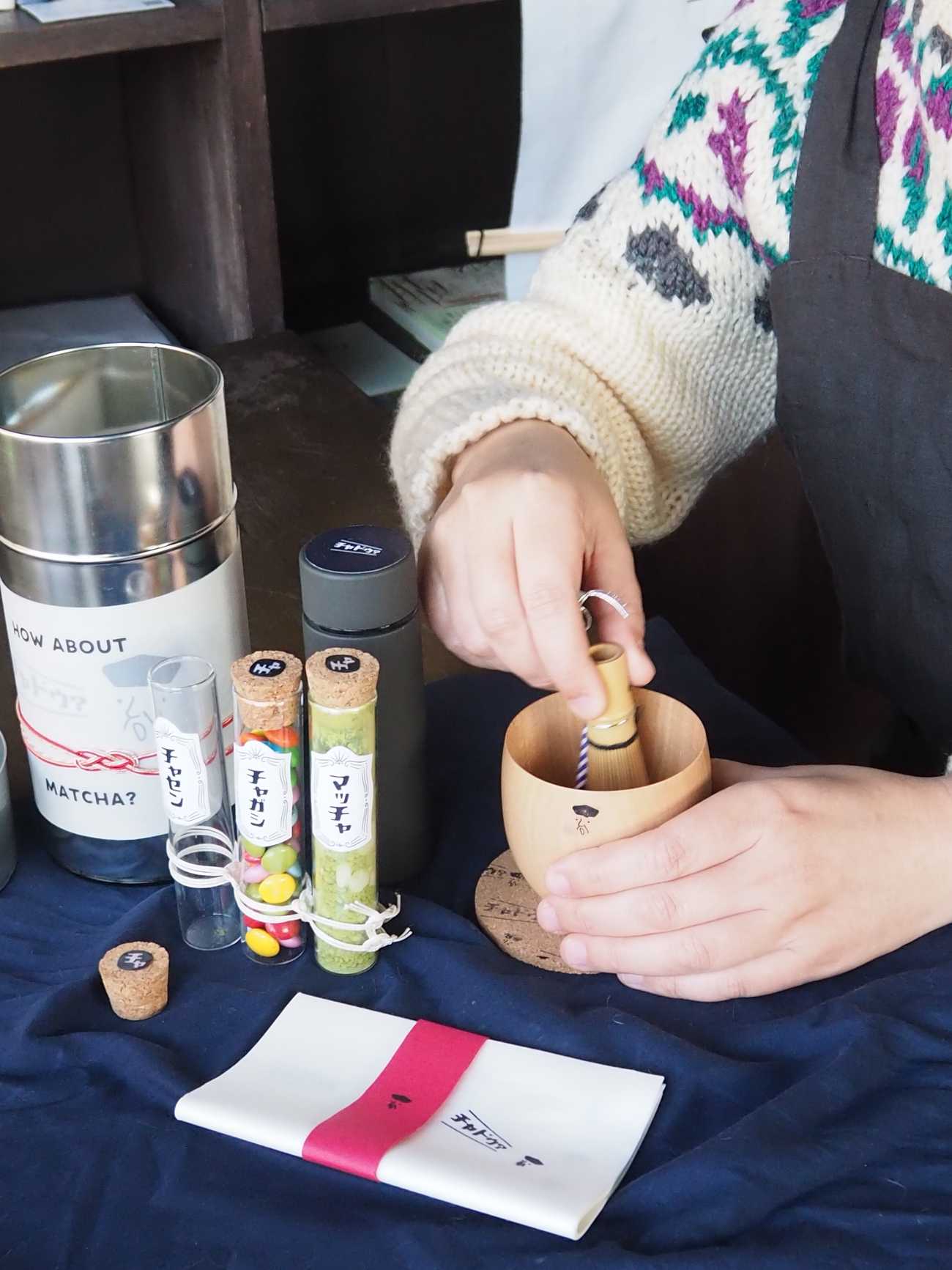 抹茶、茶菓子、茶筅、お湯全てが一つの茶筒に入って持ち運び簡単