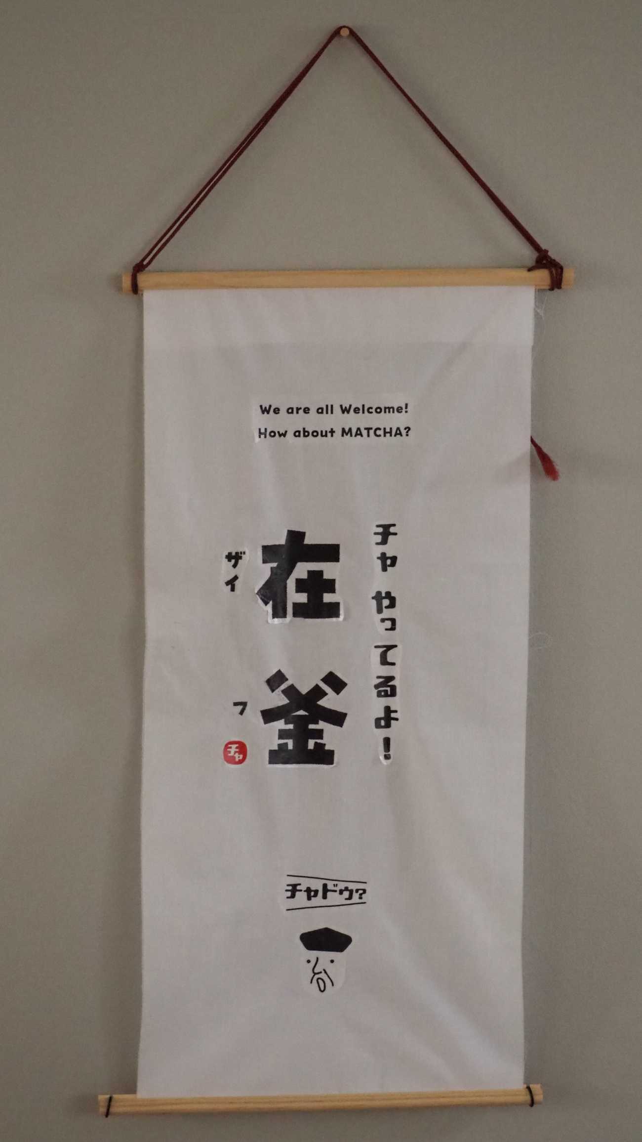 茶会をやっているお知らせの掛け軸。茶会に誰でも参加できるお知らせになっている。