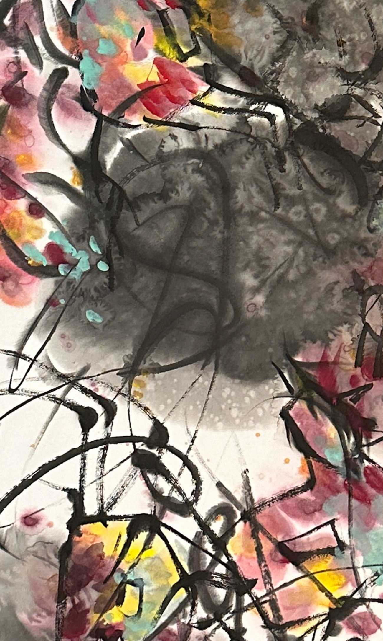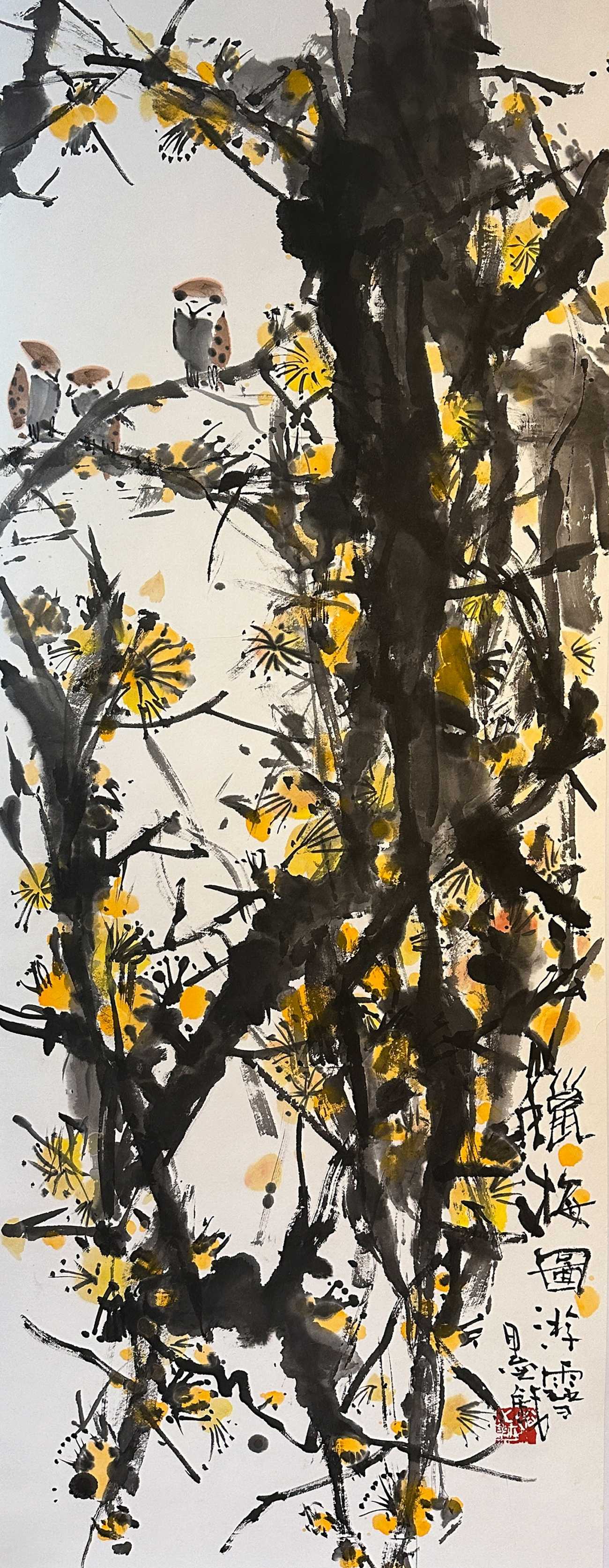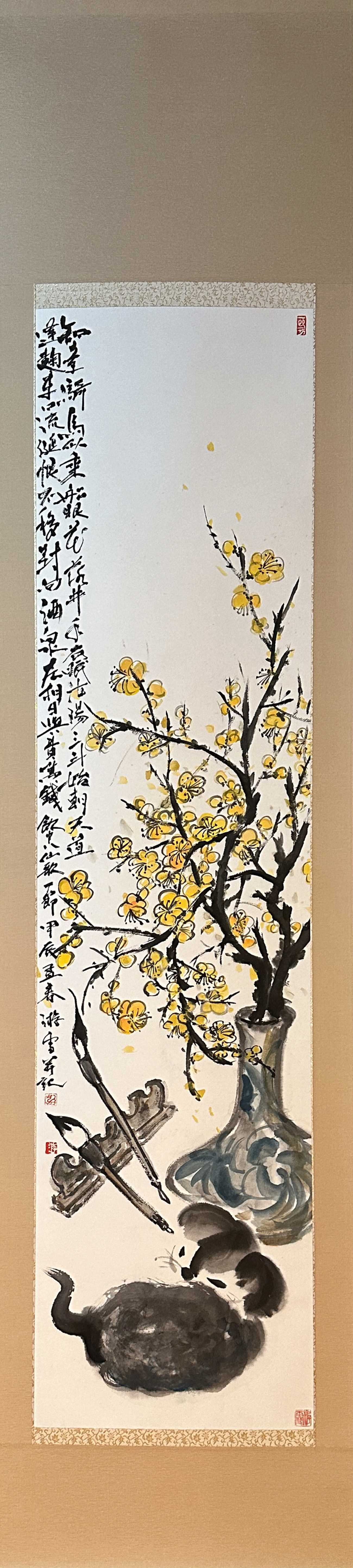 「狗子春眠圖」は、まどろむ愛犬と愛用の筆、蝋梅を描いている。賛には、どことなくユーモアがあってのんびりした雰囲気の杜甫詩『飲中八仙歌』の一節を。新春の華やかで澄んだ空気の中、筆を持つ幸せで長閑な時間を画に込めた。