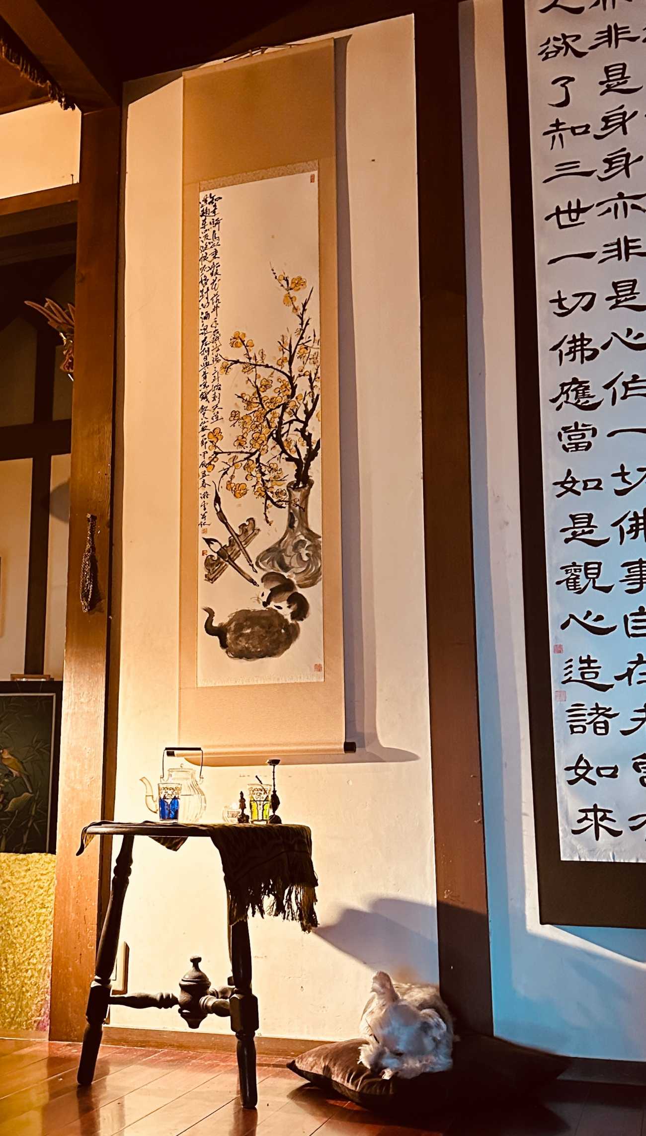 両脇の書は華厳経「唯心偈」の冒頭、”心如工畫師 畫種種五陰”。