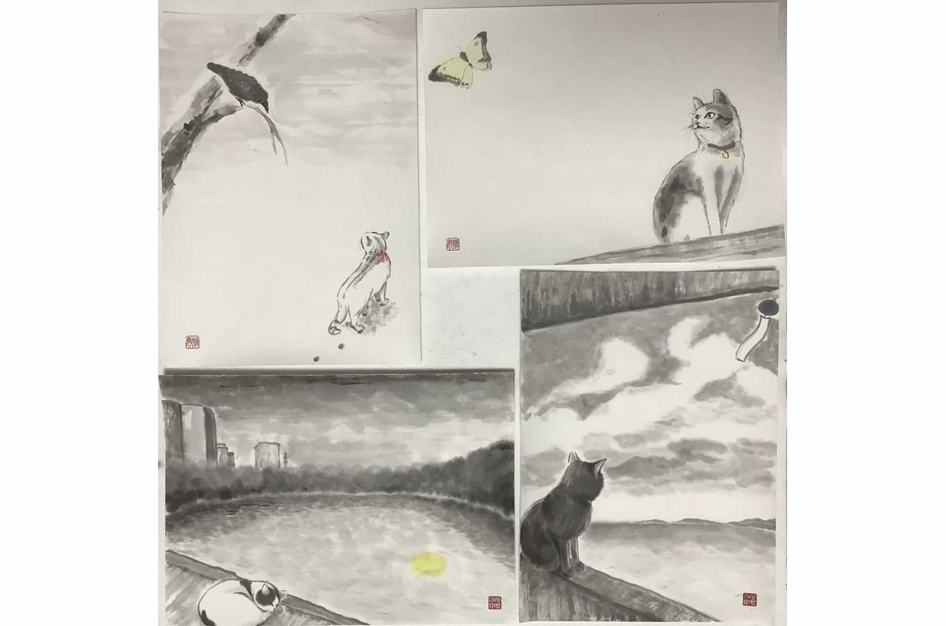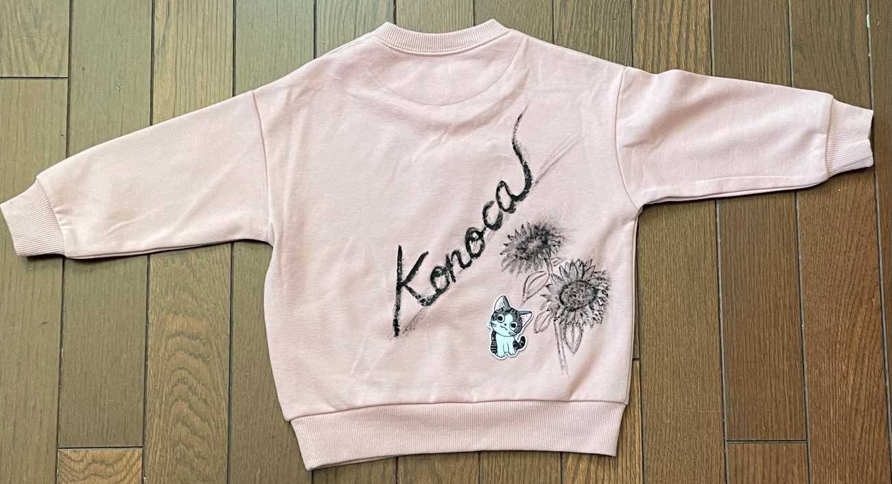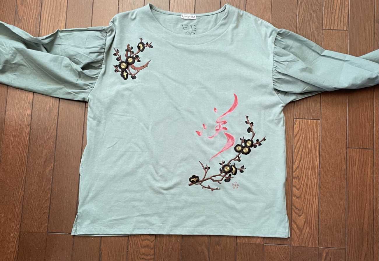 コンセプトは、春の四季の趣とした。釈文として、私は韓流の史劇のドラマが好きで、その中で着用されている女性の韓服が好きで、今回、ちょっとくすんだ翡翠色の無地のトレーナーにチマチョゴリの黒梅のアイロン刺繡を施し、文字は、私の雅号である「翠咲」の文字を使って色墨でデザインした。前面に書いてある「咲」は、伝統色の浅紅と紅緋色に金色を混ぜて、花びらが風に舞う様子を文字に込め、季節感を出した。