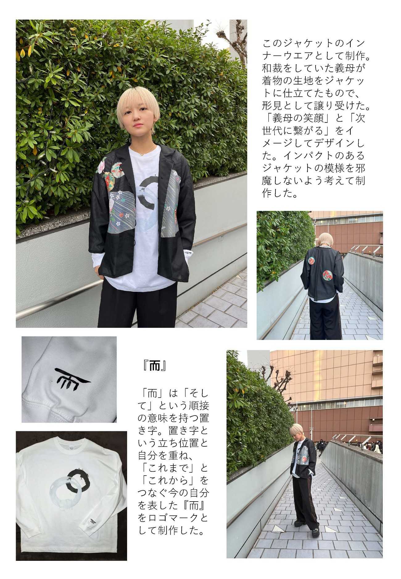 作品「つなぐ。」は、和裁をしていた義母が着物の生地で仕立てたジャケットのインナーウエアとして制作。「義母の笑顔」と「次世代に繋がる」をイメージしてデザインした。