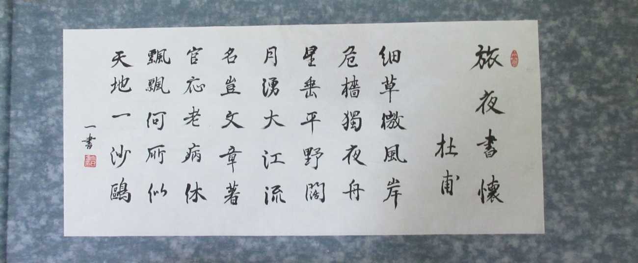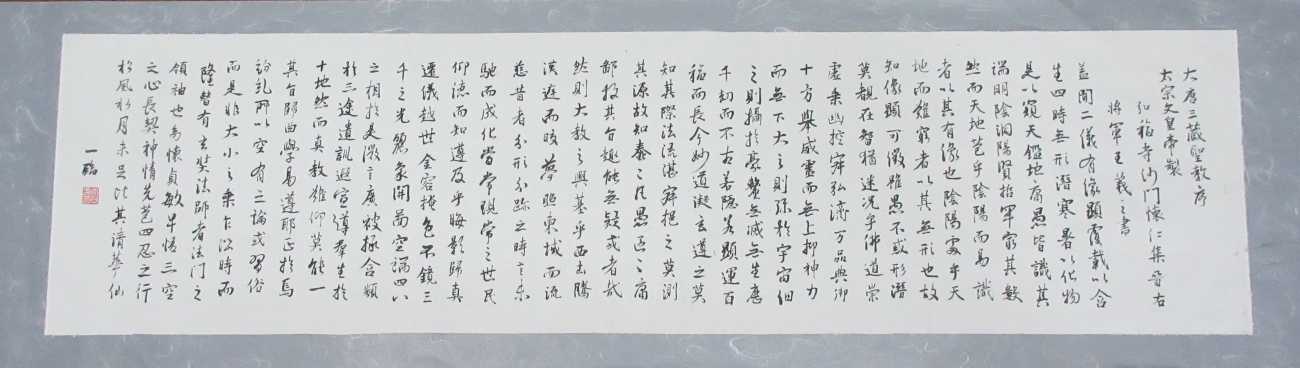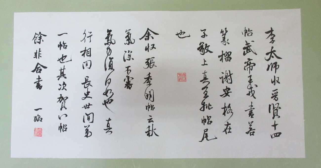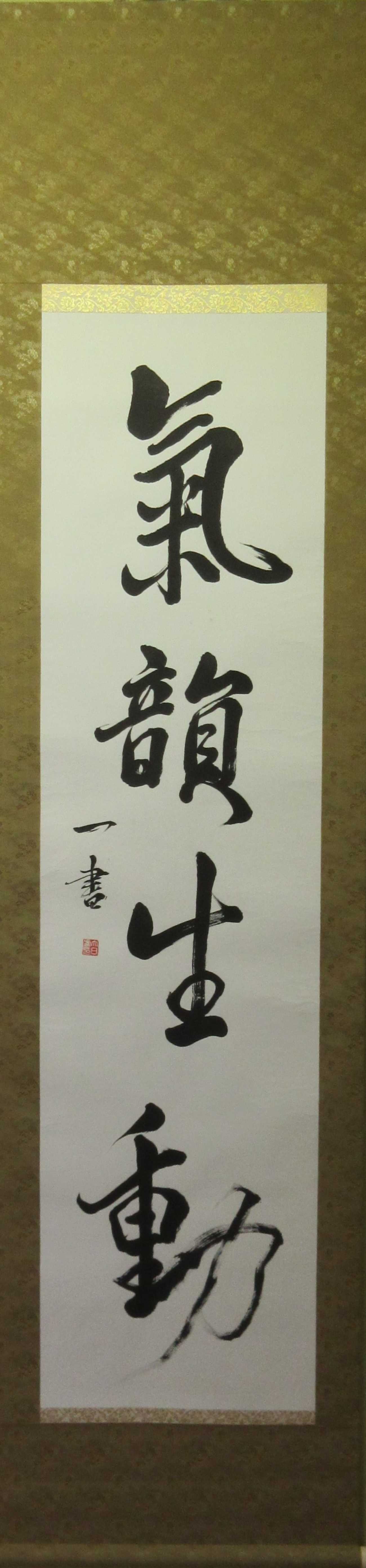 卒業制作2では伝統的表現の創作に取り組んだ。2年間の学びの集大成になる作品をと心掛けて一番目は「氣韻生動」を選字し、半切の一行書に取り組んだ。書画論を学んだ中で、謝赫や張彦遠が唱えたとされる画の六法の第一「氣韻生動」が心に残っていて、米芾の「氣」に倣ってダイナミックな「書」を心掛けた。中間講評で先生から、「動」のご指導を受けて、自分なりに修正してこの作品を仕上げた。
