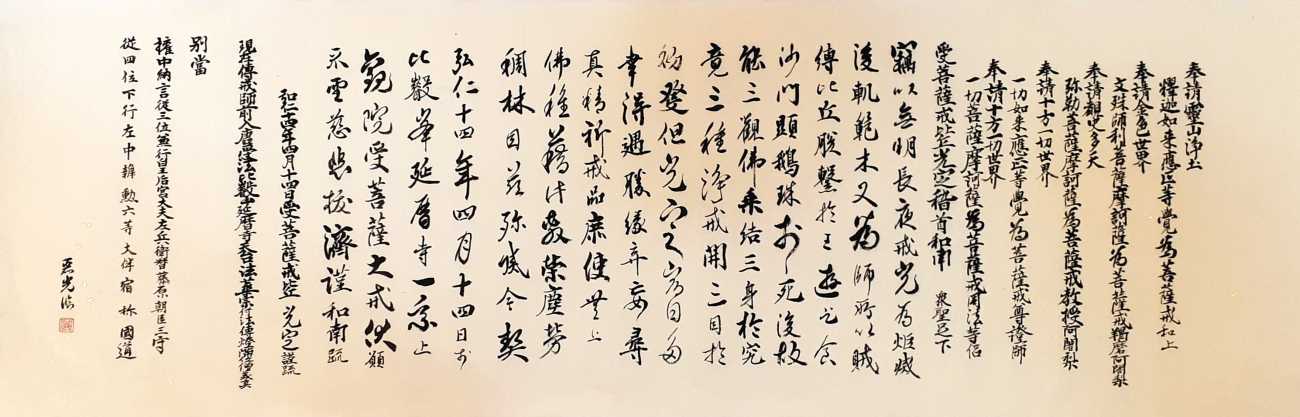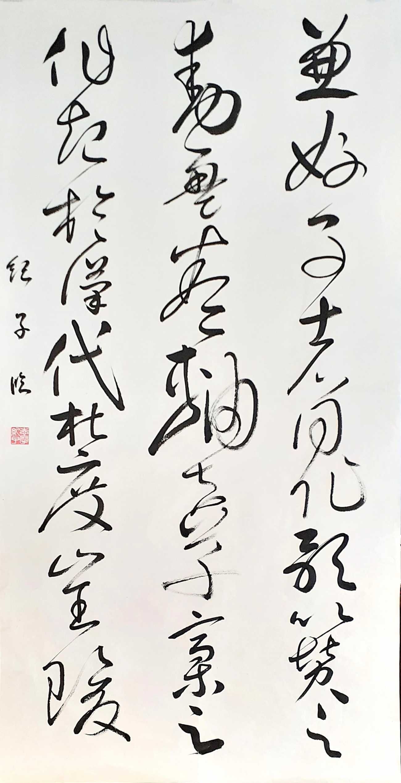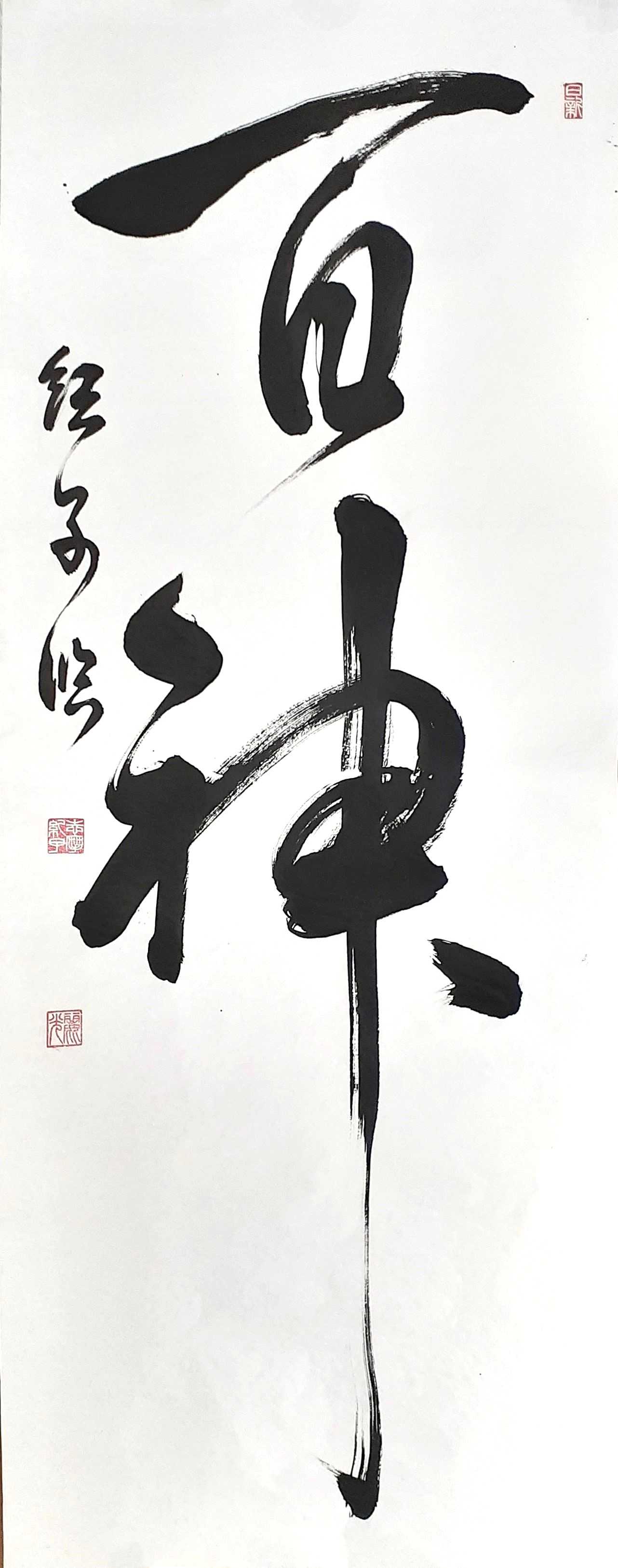 あっという間過ぎて行った私のあわただしい人生をテーマに、両親の教えや、大変だった時代に励まされた歌の歌詞をサブ作品に書きました(※著作権の関係により掲載無し)。そしてこれからは、私の周りの全てに感謝しつつ、ゆっくりと流れる時間や場所に癒しを求た文字「竹聲松影」を大字筆でおもいっきり書きました。