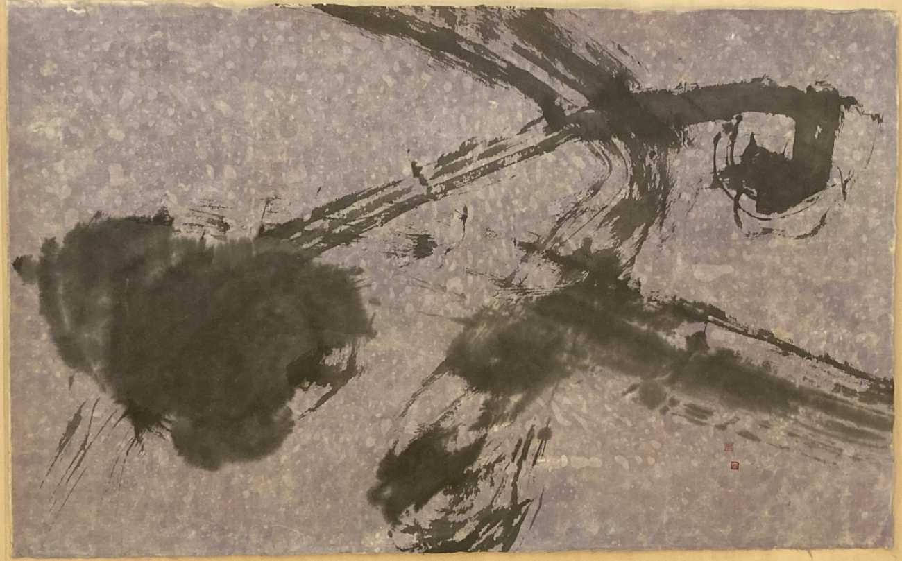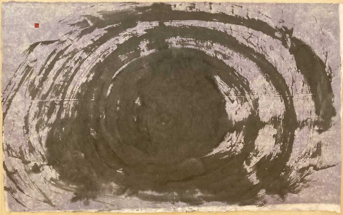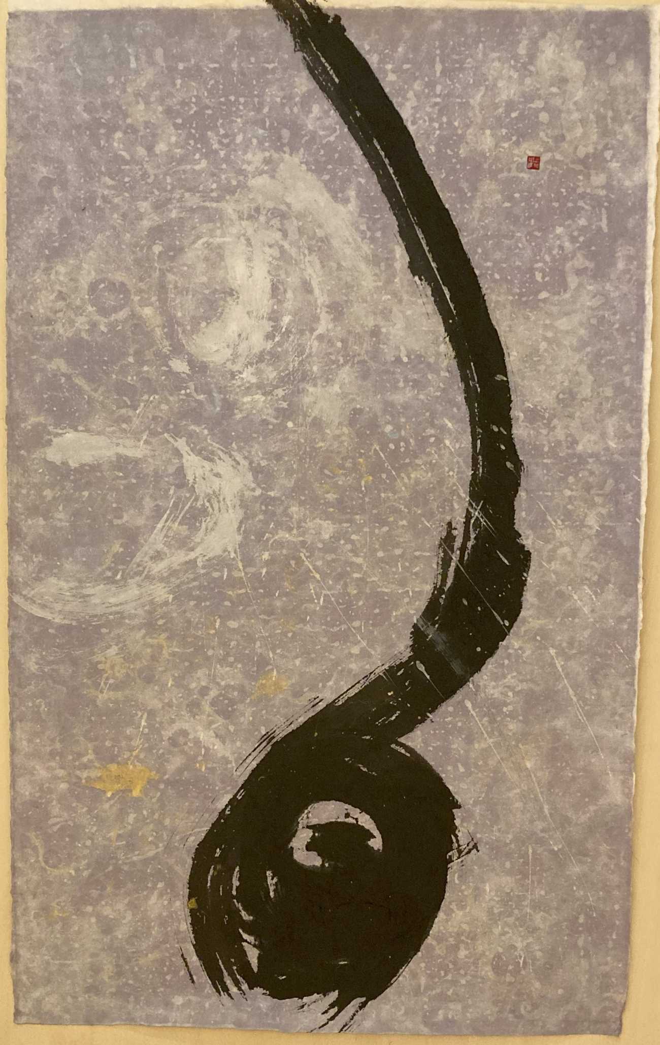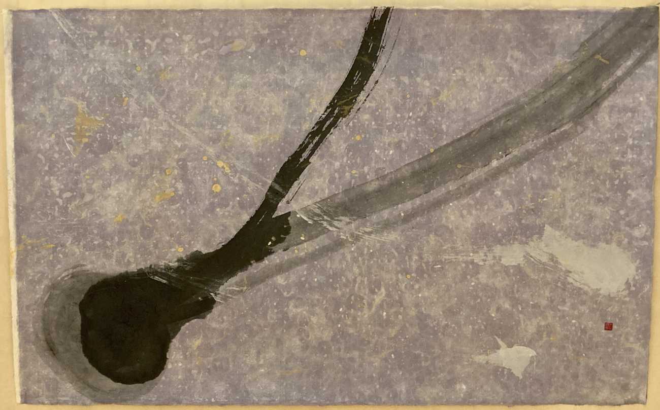 【1/4枚目:夢 創世期】夢を描く現代水墨画抽象作品。画仙紙は埼玉県比企郡の手漉き和紙(全紙サイズの変形)を用い、描画手法に関しては、抽象性・偶然性・突発性を活かし、筆と画材(墨・アクリル絵の具・ナイロン網等)で自由創作。色味により様々な光と水分のほとばしりを表現し、創世記・幼少期に、あたかも何かうっすらとした後押しに支えられながら、まっすぐに「夢」を感じながら歩む様子を描く。