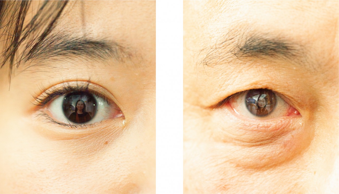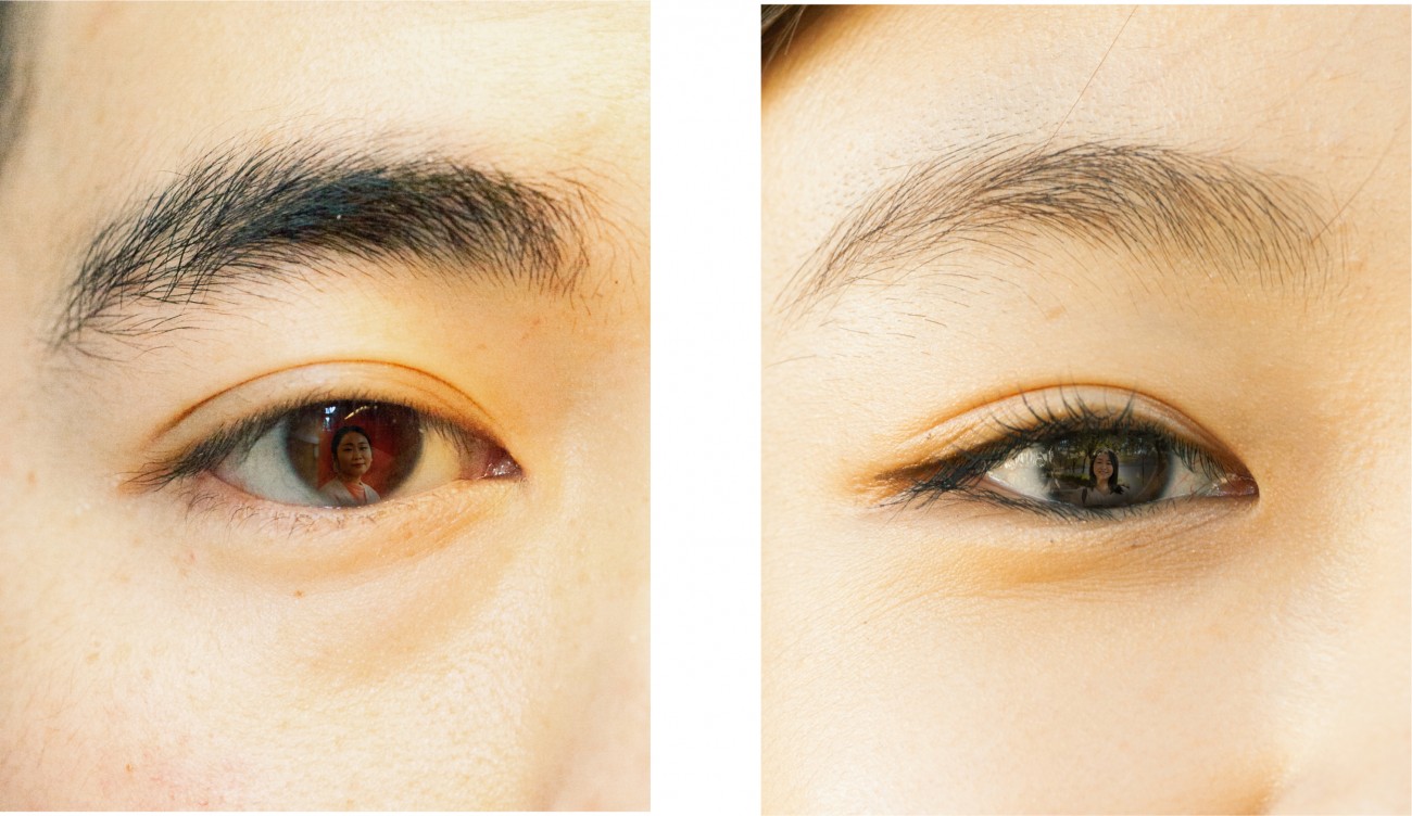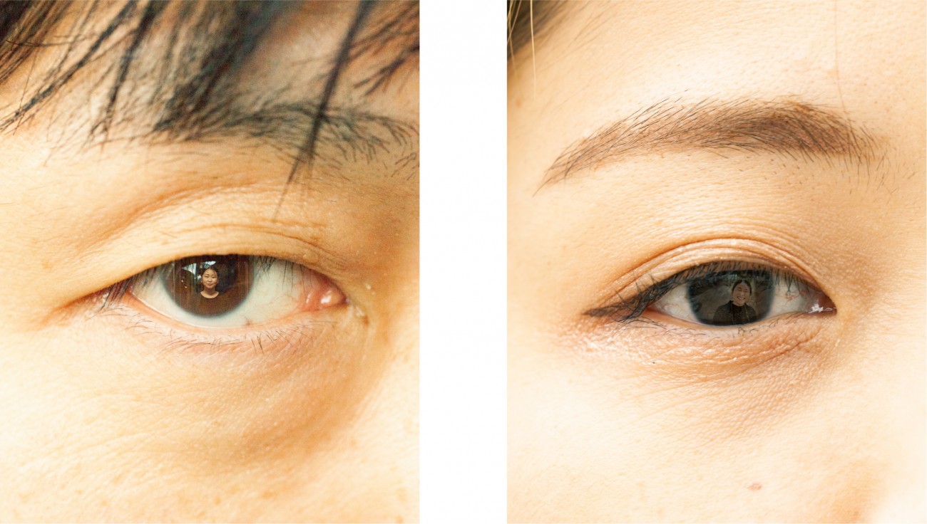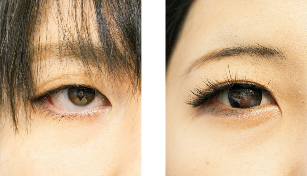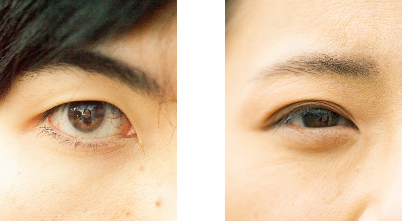 人物写真で見かける「瞳への映り込み」から発想を展開し、親しい間柄から初対面まで様々な12名のクローズアップされた目元と、カメラを渡し自由に撮ってもらった私自身の姿を組み合わせました。