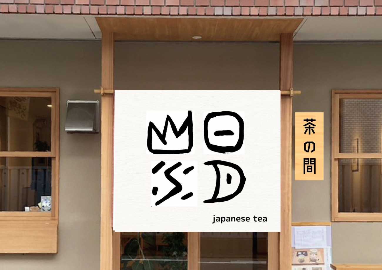 屋号「日月山水」の暖簾を制作。店のコンセプト「身体にいいもの・身体にいいこと」にあわせ、自然をイメージした象形文字で表現し、白地に黒で、目を引きやすく、周囲の景観にあえて溶け込まないようにしました。日本茶専門店であることをデザイン的にjapanese teaと入れることで表現しました。何のお店か分かりにくいが、暖簾の屋号を覚えてもらうことが目的なので、日本茶の表現はここで留めました。何のお店か分かりにくい所は、表にメニュー看板を置くことで解消予定です。