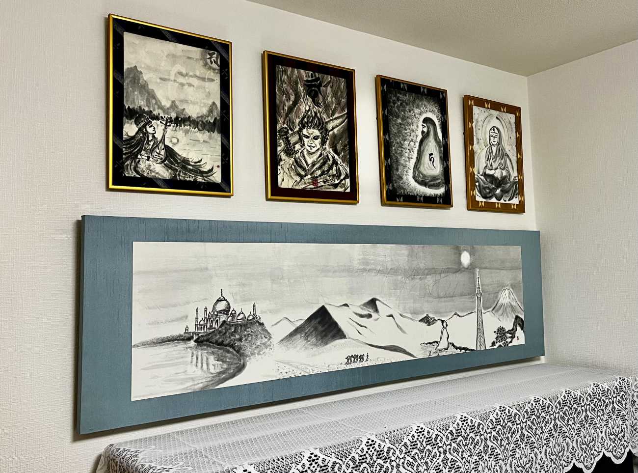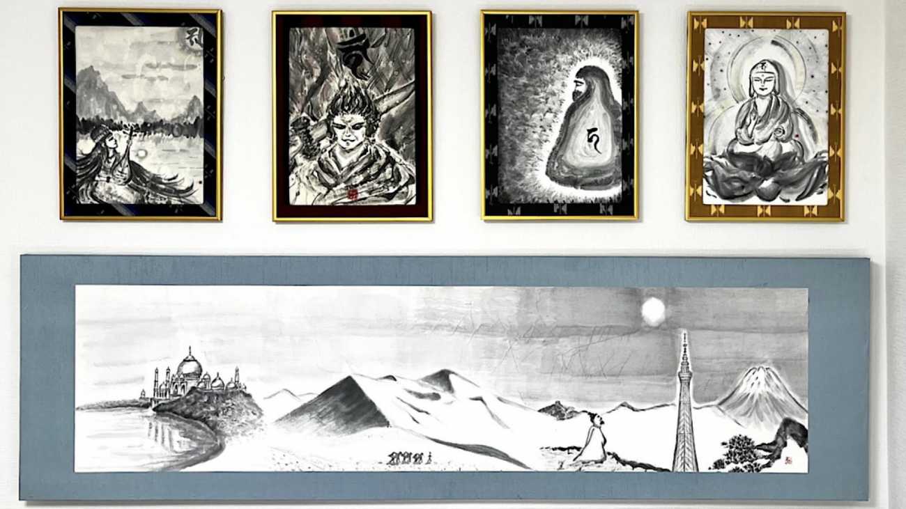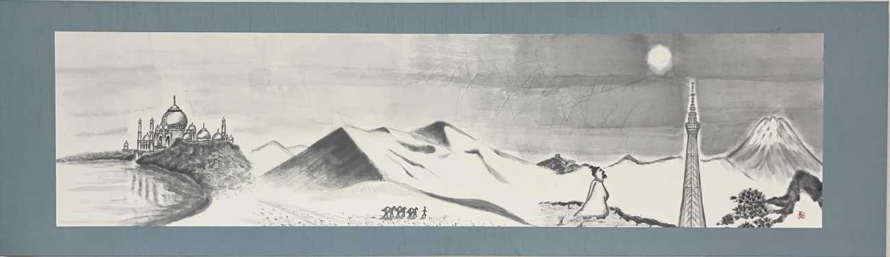 その下の半切横長の作品には、仏教・書画の伝来及び、世界は同じ空の下にあるという平和を祈念した絵を描きました。
