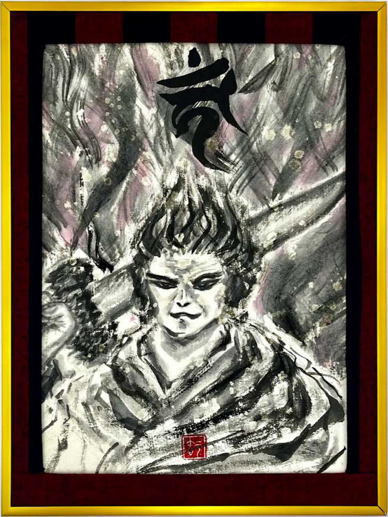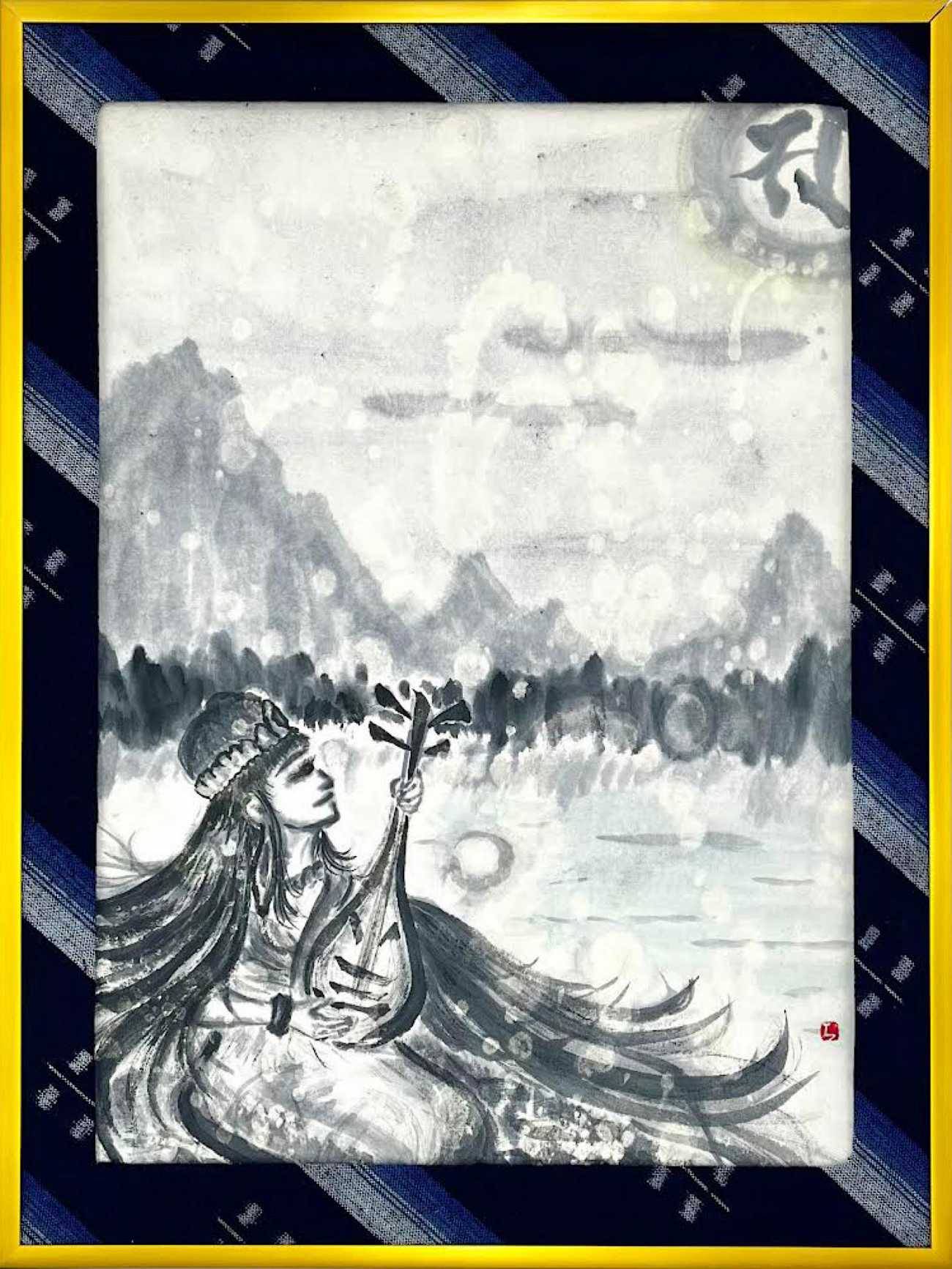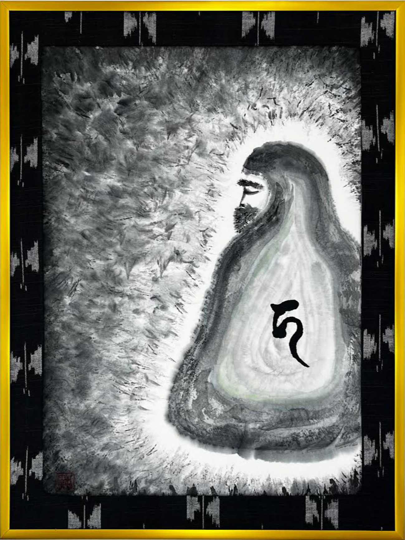 小作品は現代的な仏画で喜怒哀楽を表現し、地元伝統工芸品の久留米絣を使い自分の手で縁取りました。