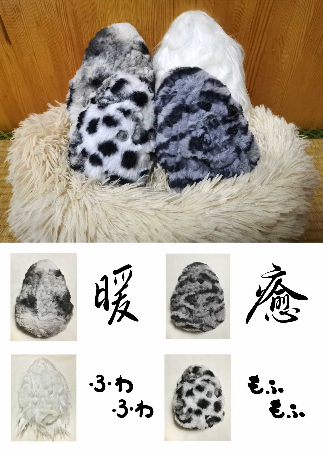 ペットのお腹や背中をなでるをイメージして作った作品です。羊毛フェルトで、ペットをなでる時の気持ちを文字「暖」「もふもふ」「癒」「ふわふわ」で刺して、中に綿を話めました。文字は見にくいですが、手で触ると感じられます。手で触る動作もペットをなでる動作と同じで、柔らかさと癒しを感じます。普段はあまり意識せず、毎日そばにいてくれるペット、またぬいぐるみたちへの感謝を込めた作品です。