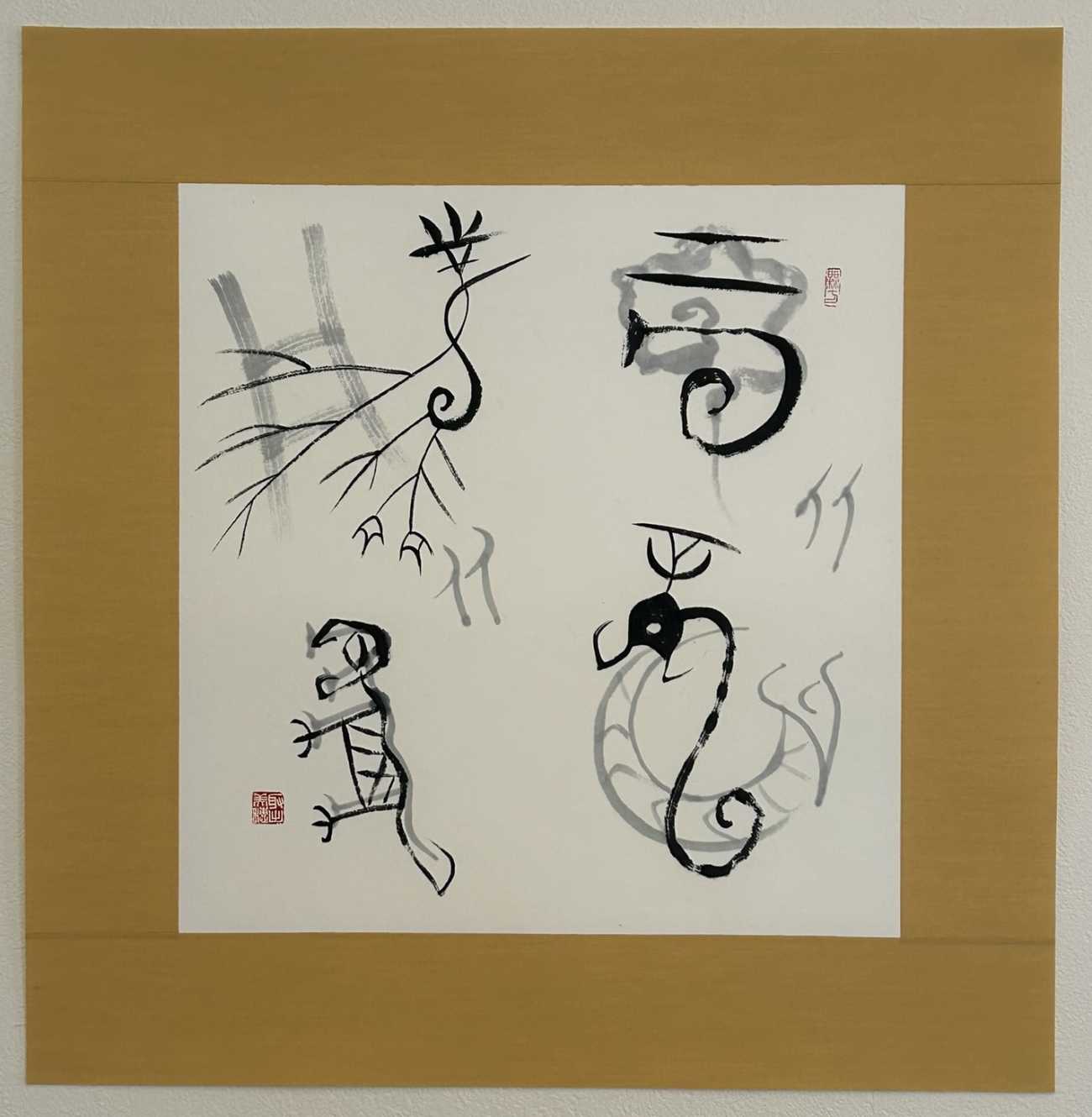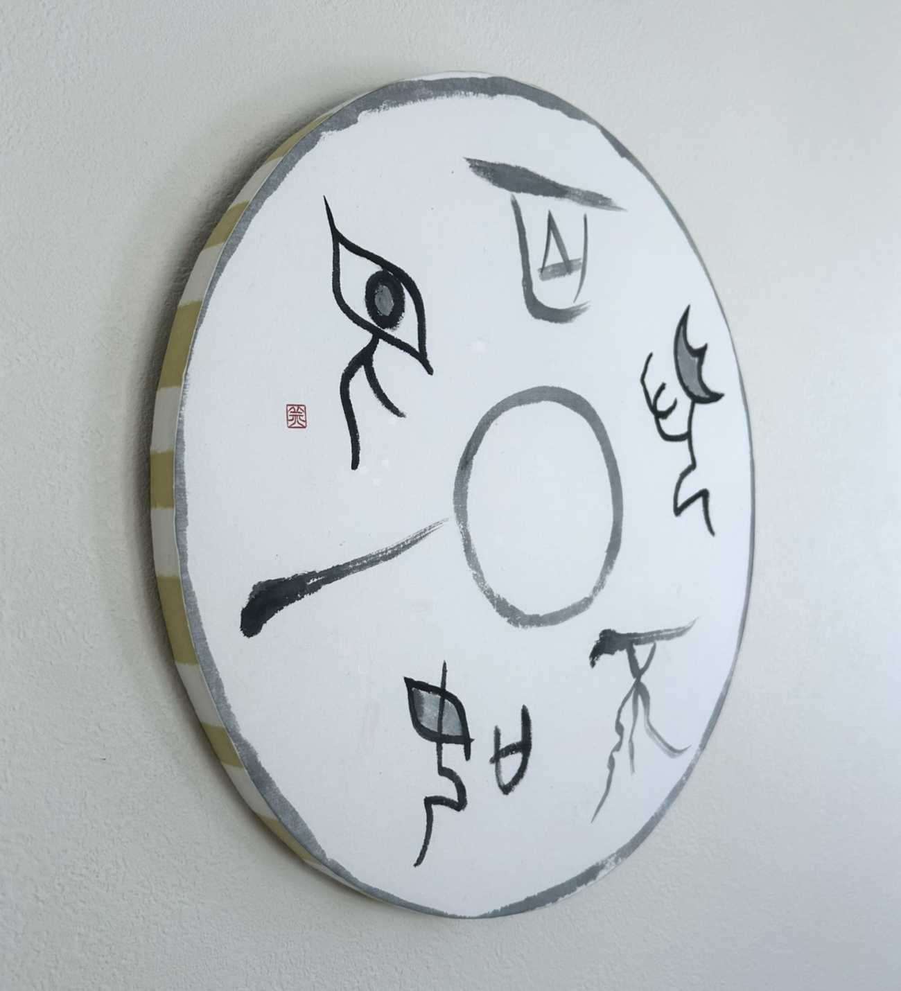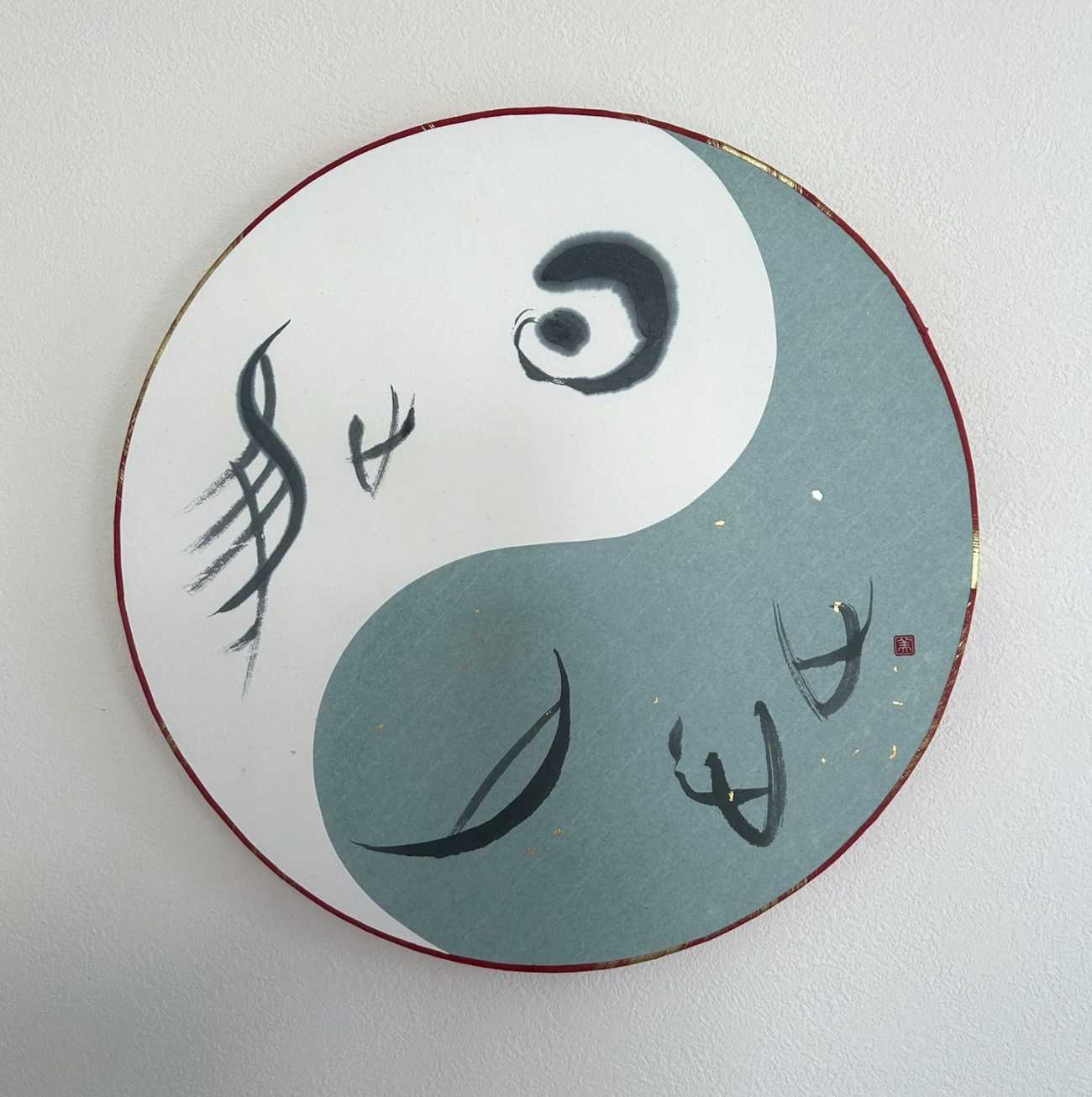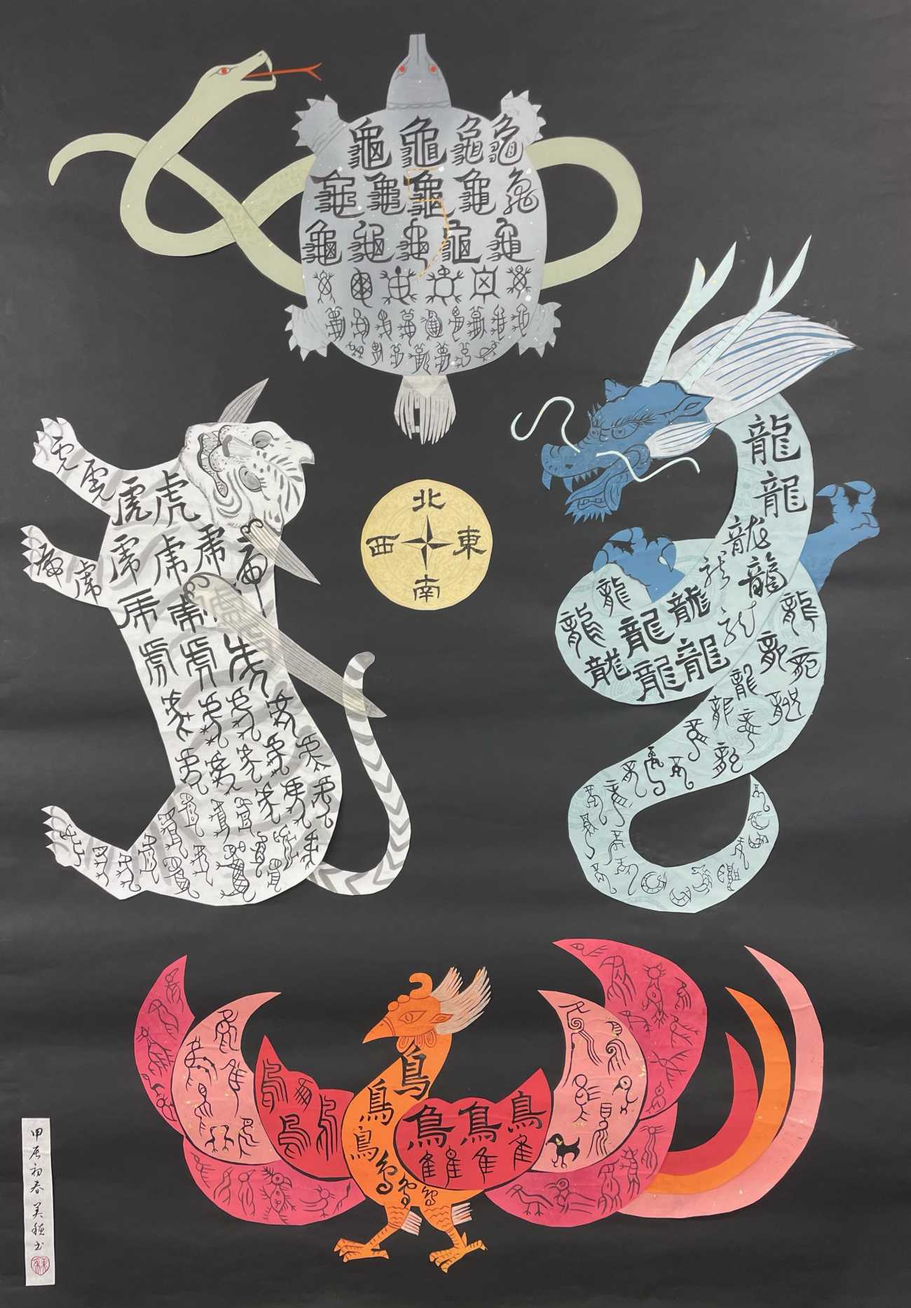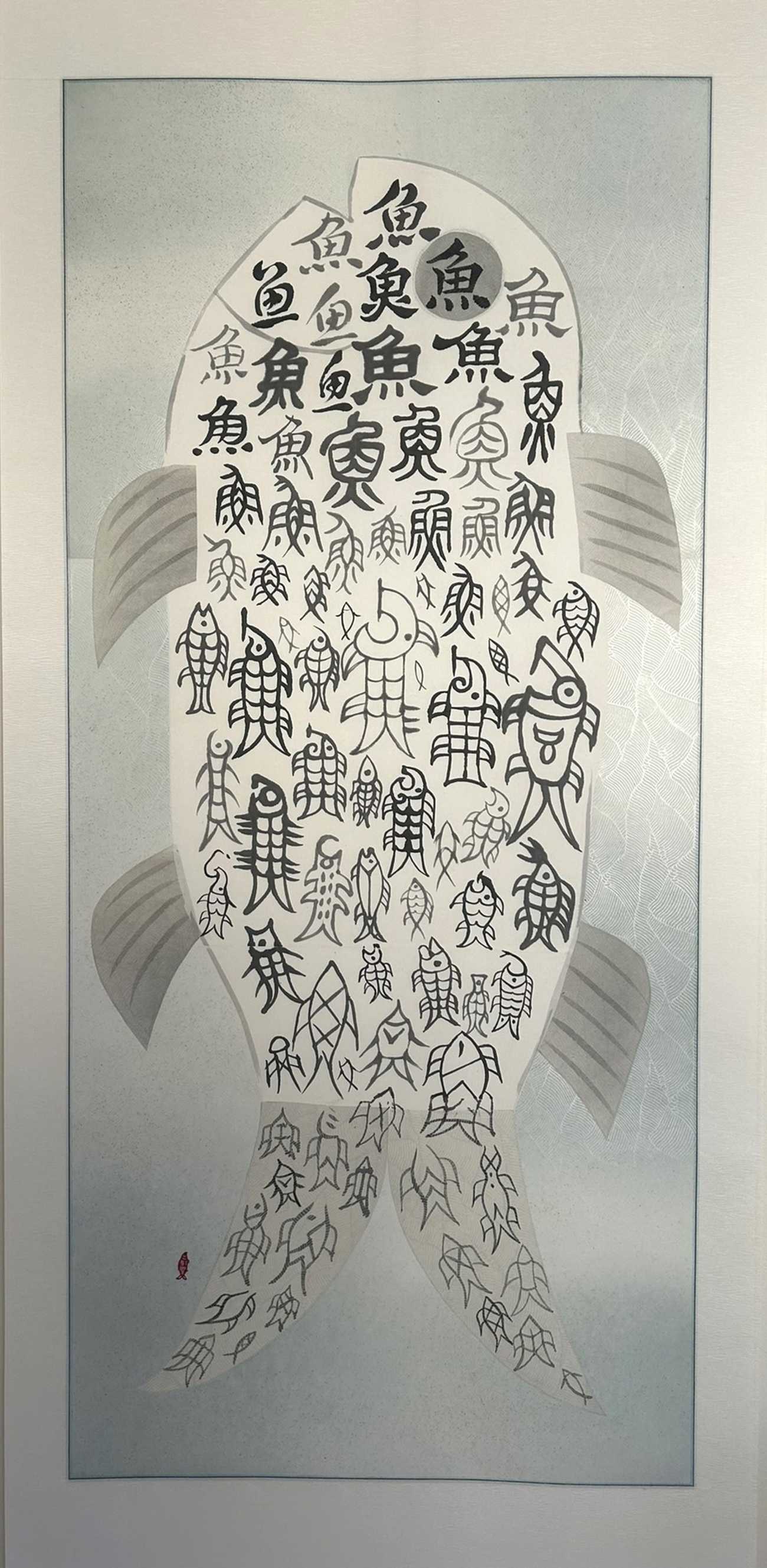 漢字の多くは象形文字であり、その造形の妙には感嘆せずにはいられない。漢字の始まりである甲骨文字の「魚」は、その形態的特徴を見事に表現している。その後、金文、大篆、小篆、隷書、草書、行書、楷書と、時代や社会の発展と共に、漢字の書体は劇的に変化していった。尾鰭の甲骨文字から頭の楷書に向けて、大きな魚のフォルムの中に、その書体の変遷を表した。背景は、さざなみがゆらめく水中である。白い一匹の魚がゆったりと泳ぐのは、3000年を超える大きな時間の流れの中である。