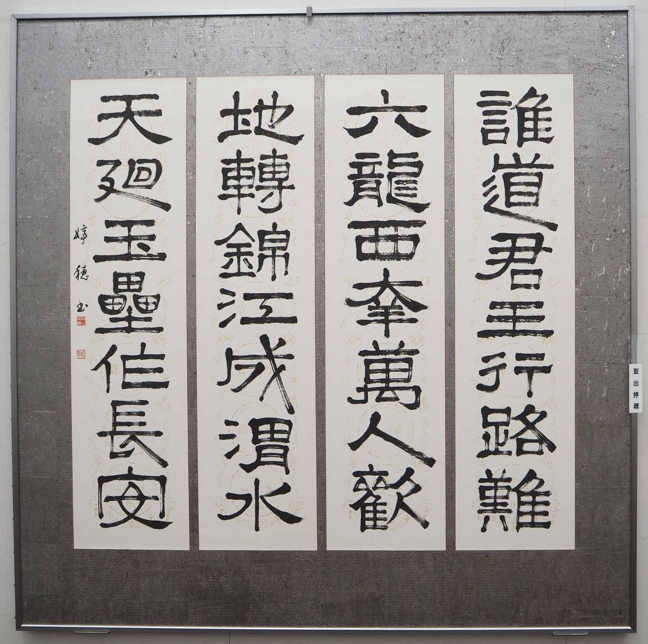 漢字の多くは象形文字であり、その造形の妙には感嘆せずにはいられない。漢字の始まりである甲骨文字の「魚」は、その形態的特徴を見事に表現している。その後、金文、大篆、小篆、隷書、草書、行書、楷書と、時代や社会の発展と共に、漢字の書体は劇的に変化していった。尾鰭の甲骨文字から頭の楷書に向けて、大きな魚のフォルムの中に、その書体の変遷を表した。背景は、さざなみがゆらめく水中である。白い一匹の魚がゆったりと泳ぐのは、3000年を超える大きな時間の流れの中である。