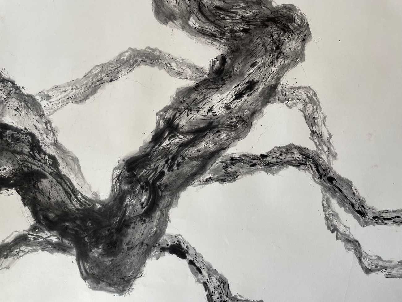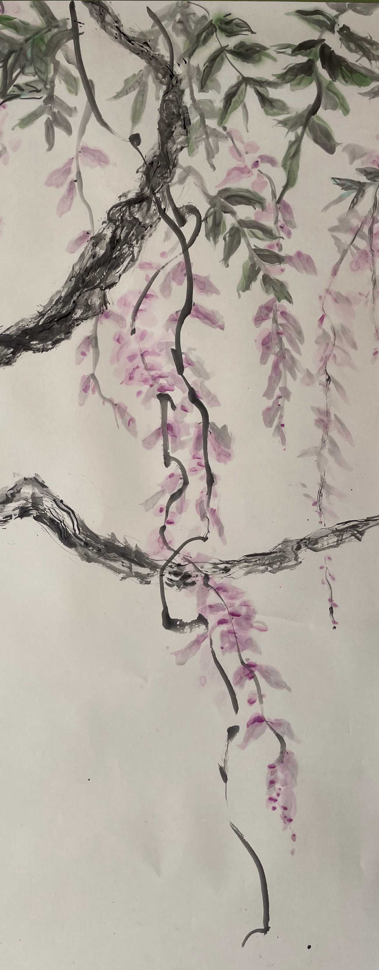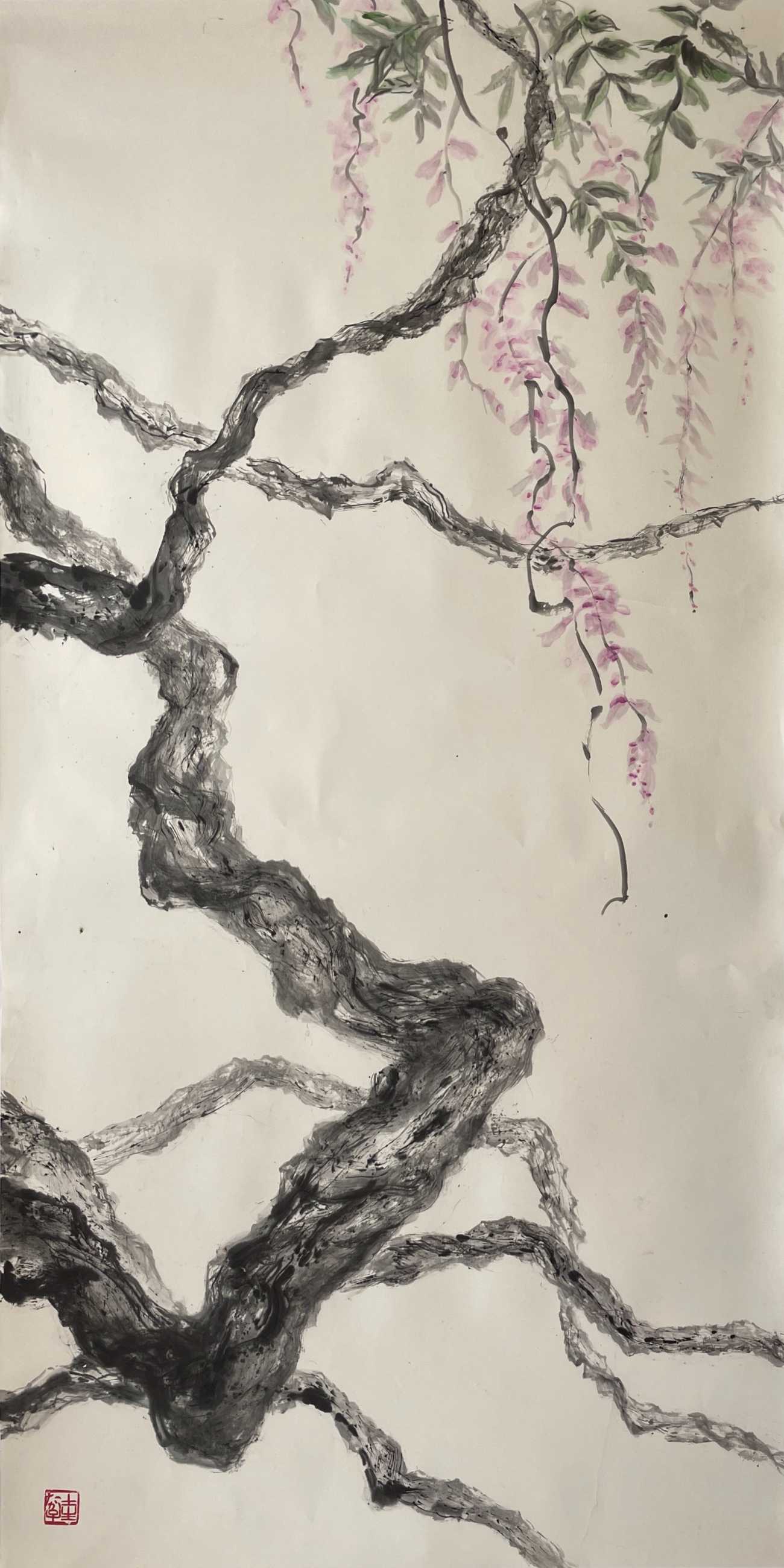 藤の花も見事だが、藤の株の力強い造形に感動し、この株を表現したいと考える。カブを主にしたかったので、藤花は控えめに表現することにした。