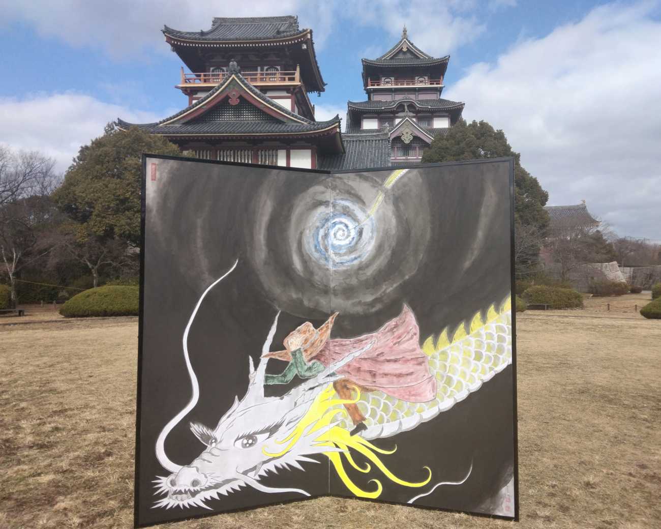 back 美術科 - 書画コース 水浦 真悟 「さらば、少年の日よ」 人生の折り返し地点を過ぎて後ろを振り返った時、チャンスを逃して一人ポツンと突っ立っている自分が見える。この作品は新たなる自分をコンセプトに、人生の節目(勝負所)に孤独や覚悟を再認識して前に進めればと言う思いで描きました。臆病風に吹かれそうな時、そっと背中を押してくれる様なそんな勇気を与えてくれる絵になればと思います。 「さらば、少年の日よ」 「降龍」 「桃太郎」 「道」 ―迷わず行けよ、行けばわかるさ。― X Facebook LINE