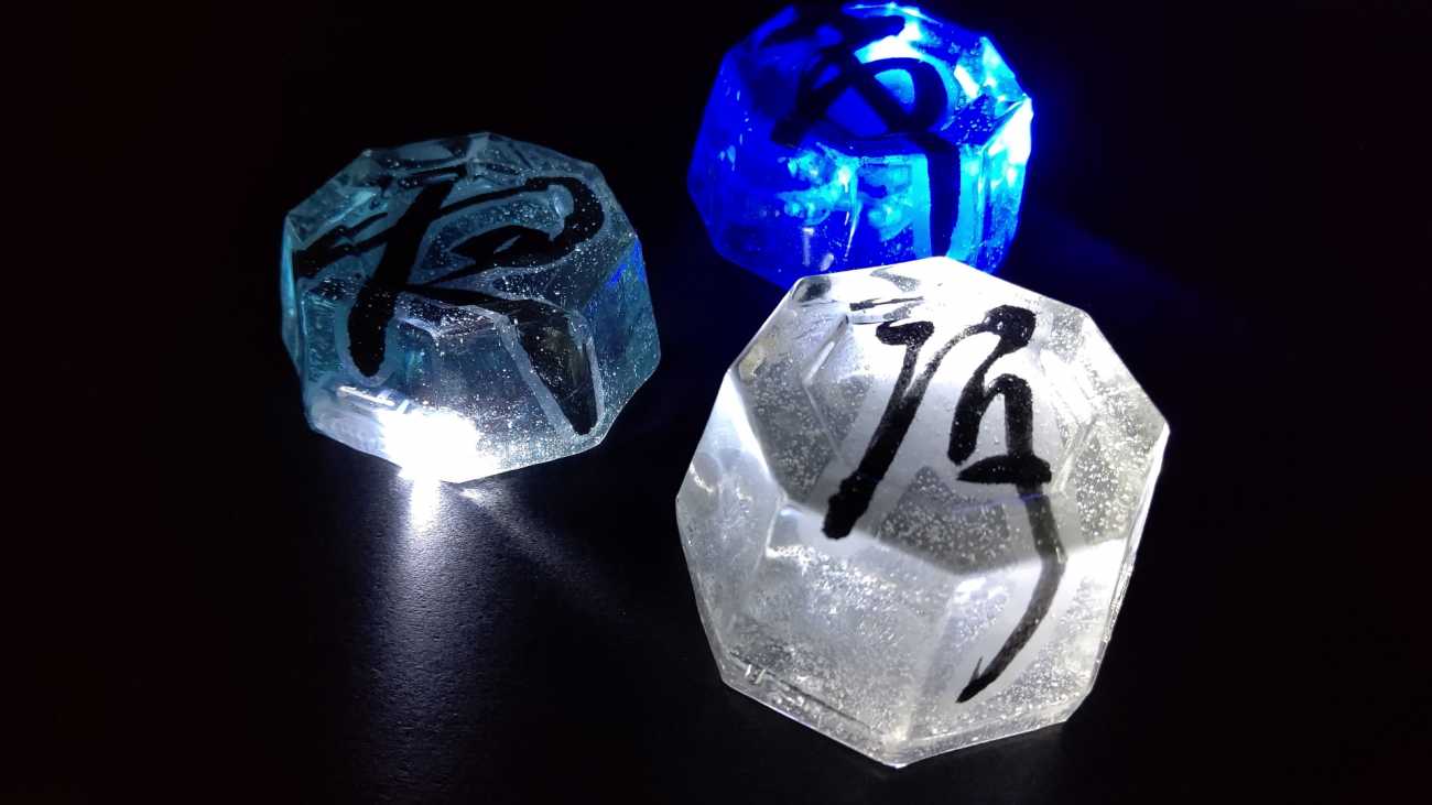 寝室に置けるようなオブジェは小物置きとしてライトとして使用でき、封入された文字は見る角度によっては単なる黒い柄に過ぎない。