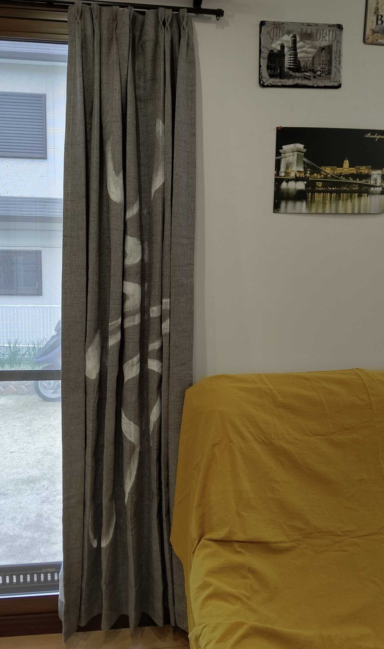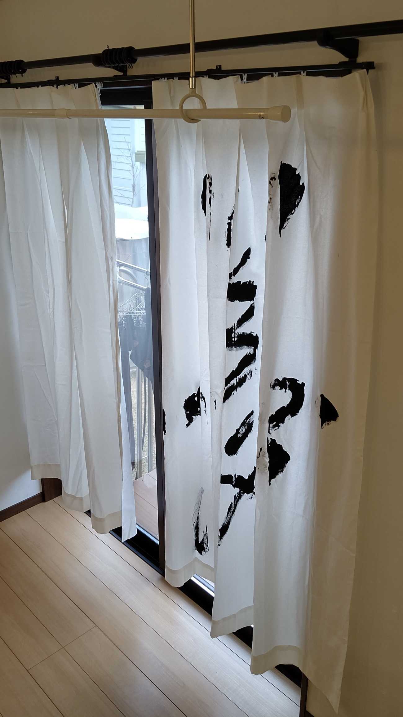 開閉し動きのあるカーテンに書かれた書は状態によっては文字にもデザインにも変化する。見る人の位置によって見え方を変え、作品から見る人へ様々なメッセージを伝える。