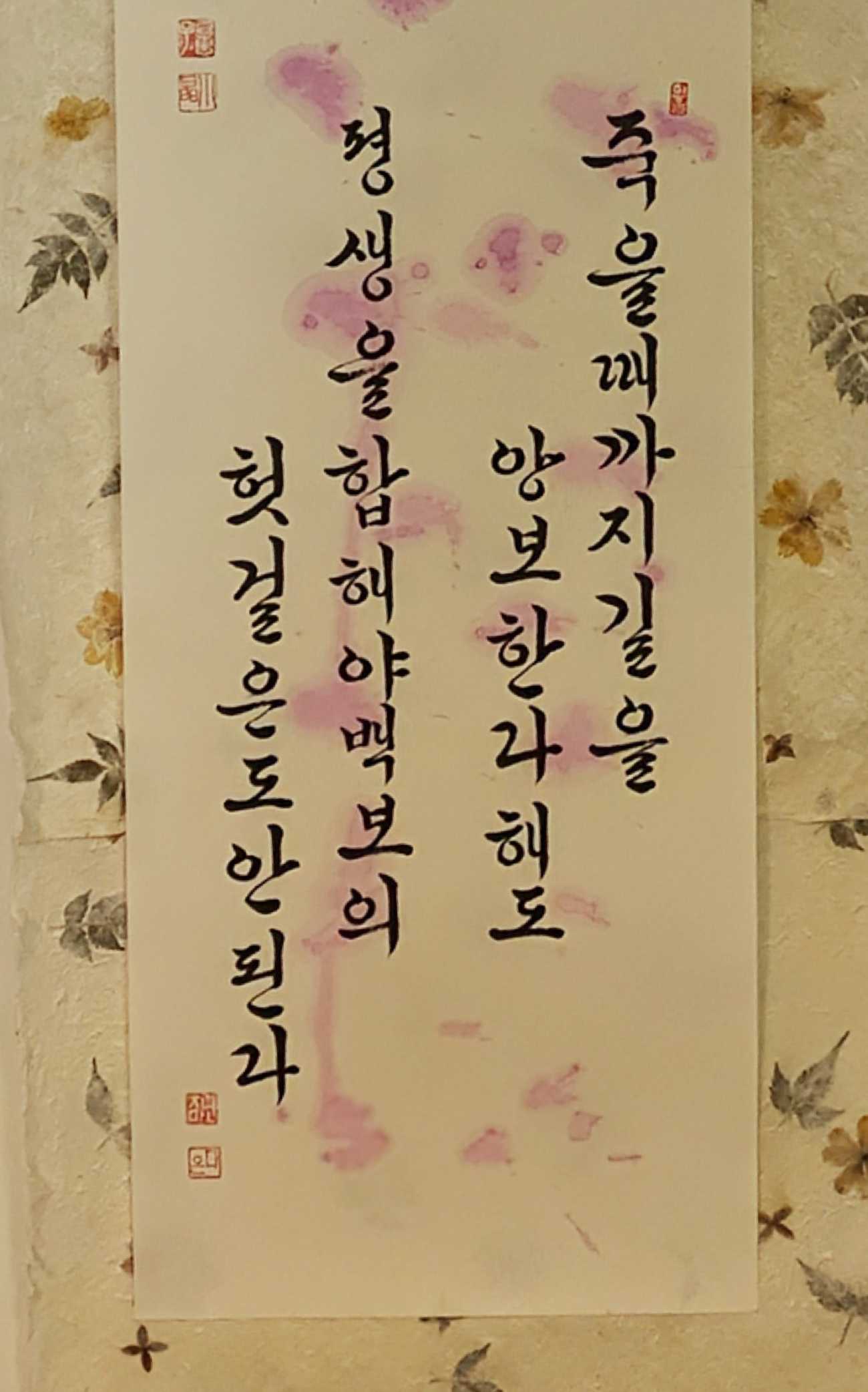 back 美術科 - 書画コース 小嶋 千恵子 「ハングル書芸コラボ作品」 終身譲路 不枉百歩 (終身路を譲も 百歩を枉げず) 道を譲るために曲げた距離は、百歩にもならない (一生、道をゆずっても、たかだか百歩に過ぎない) 죽을때까지 길을 양보한다해도 펭생을합해야 백보의 헛걸은도안된다 「ハングル書芸コラボ作品」 「ハングル文字拡大」 「李白 怨情」ー美人捲珠簾 深坐嚬蛾眉ー 「欧陽詢 九成宮醴泉銘」 -原寸節臨ー 「孟浩然 春暁」ー春眠不覚暁處處聞啼鳥ー X Facebook LINE