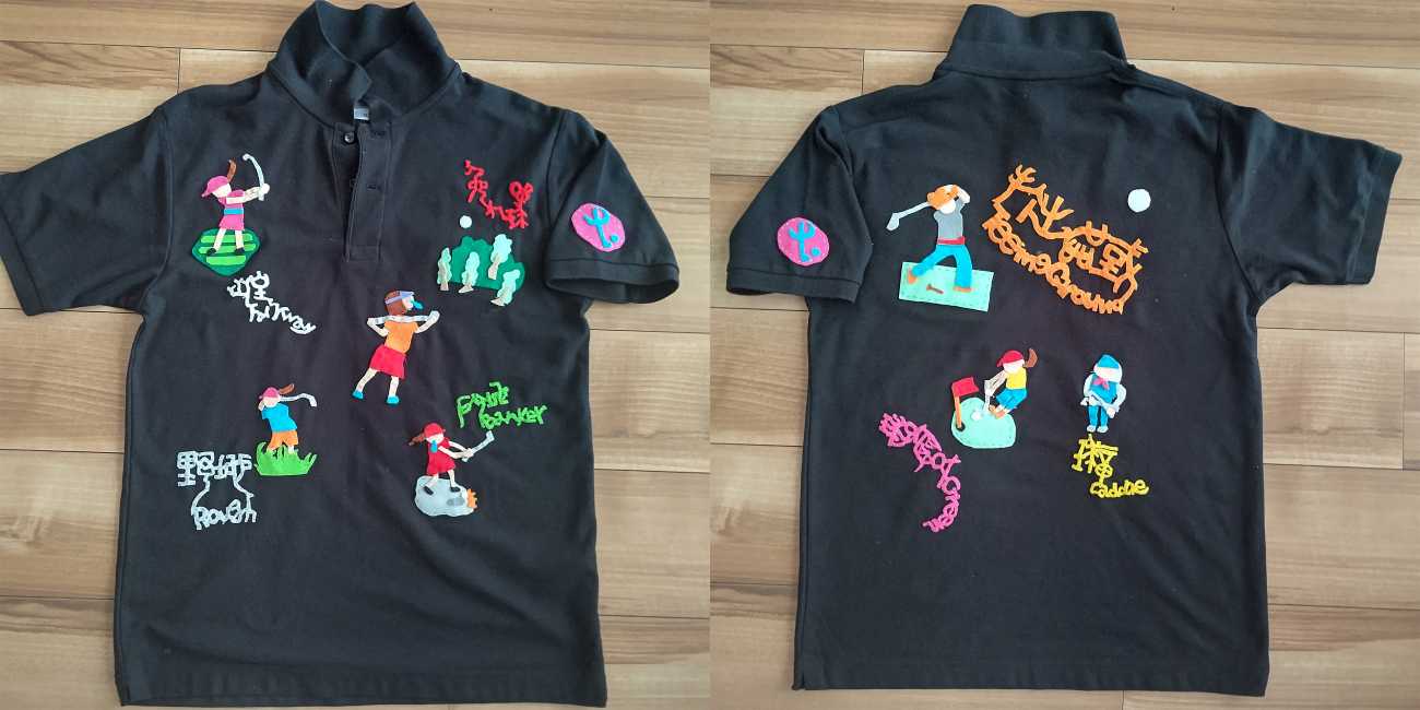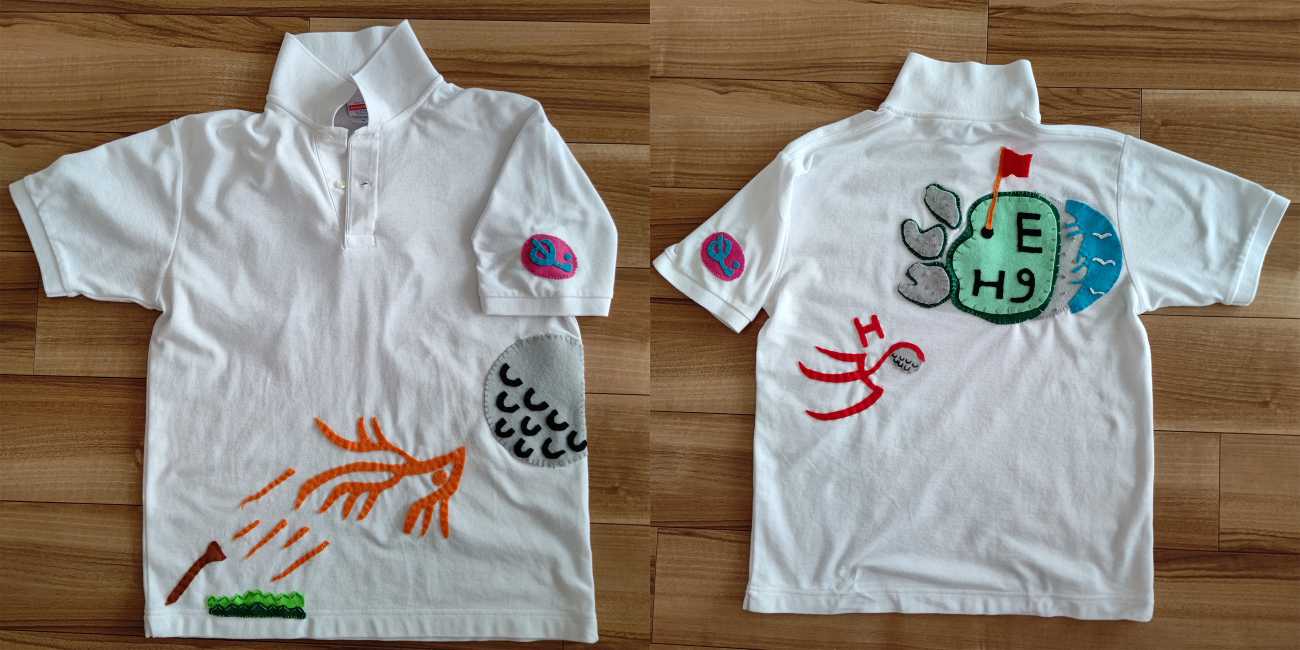 ゴルフに着る白ポロシャツに、今まで体験したなかで印象に残っている「思い出」を洗えるフェルトを使ってデザインした。その「思い出」とはラウンド中にカラスがカートにあったオニギリをくわえて逃げて行ったことである。表面は(遠くまでボールが飛んで行け!)の思いで、篆書体の「行」を表し、またカートから袋(篆書体)とオニギリのパッケージ(平仮名「う」)が飛んでいく様子を表している。裏面では、篆書体の「頂」を使ってカラスが梅おにぎりをくわえて飛んでいるシーンを表現した。