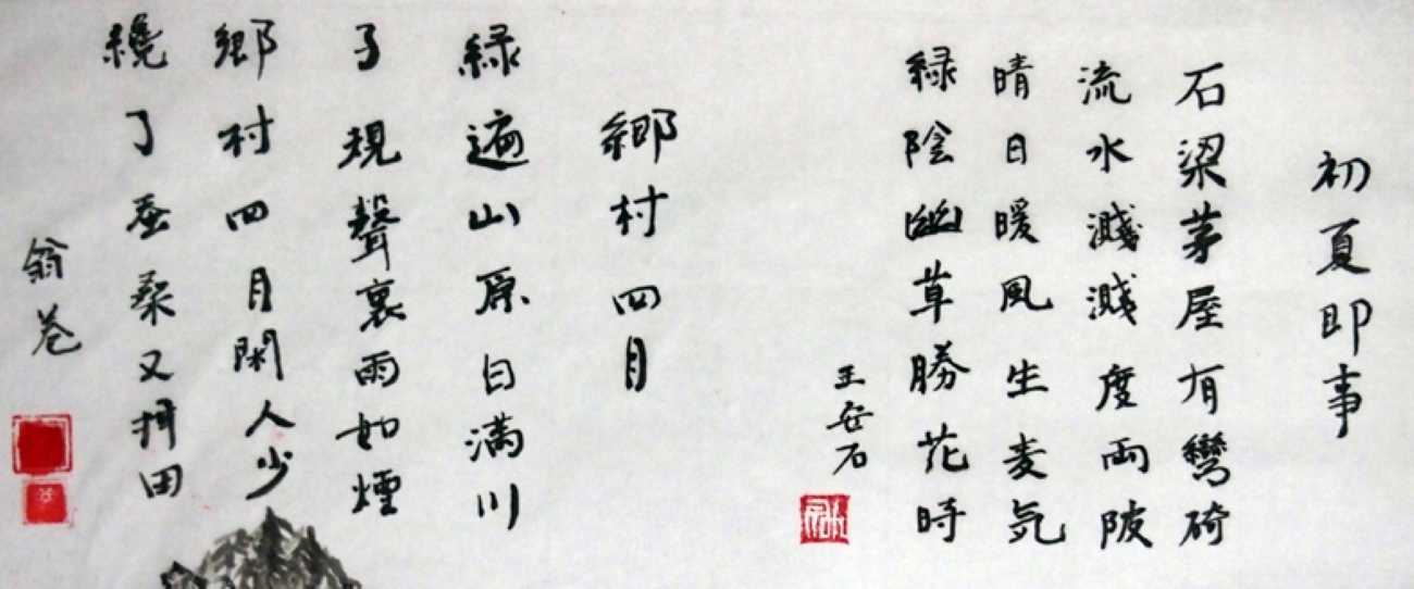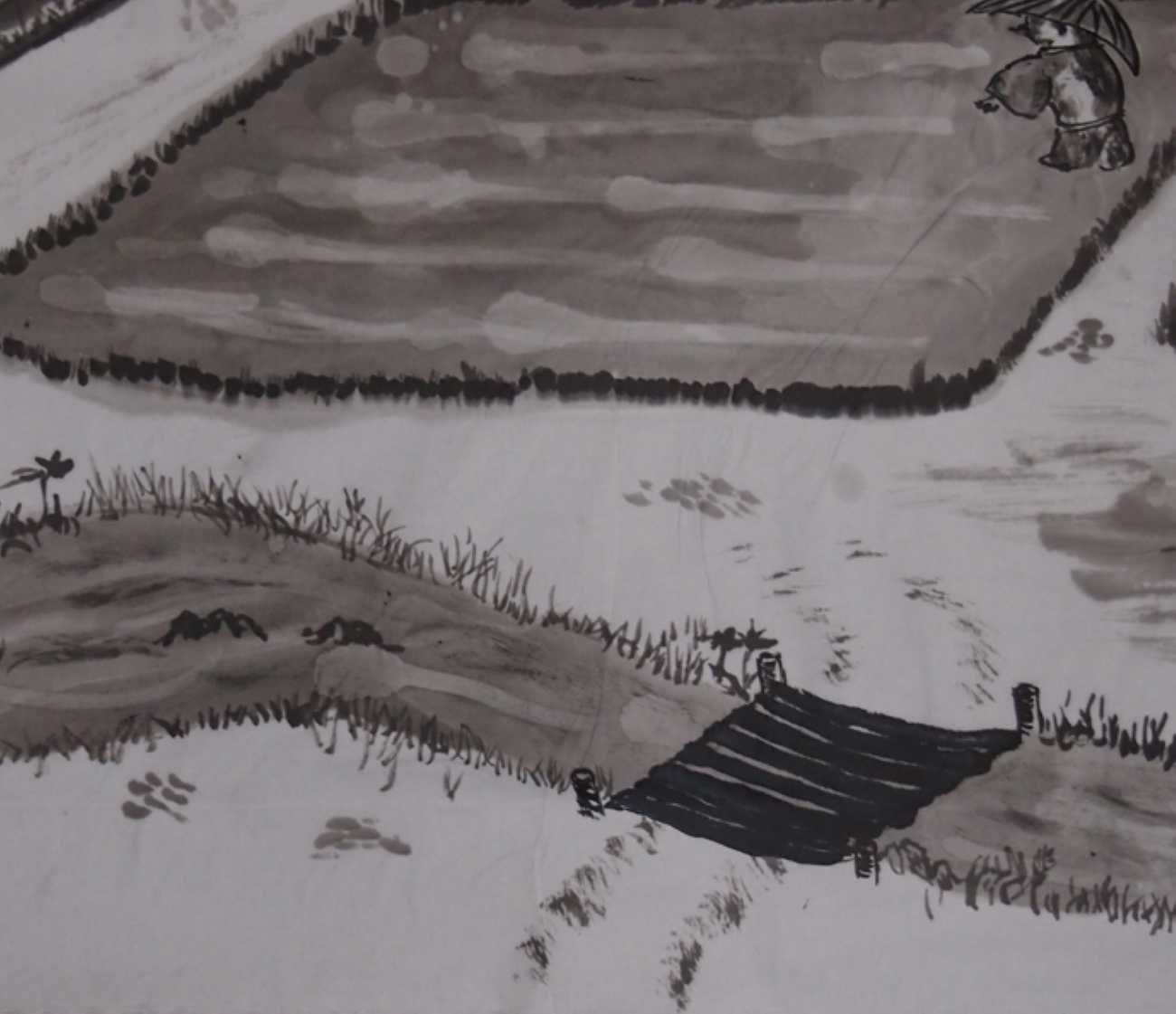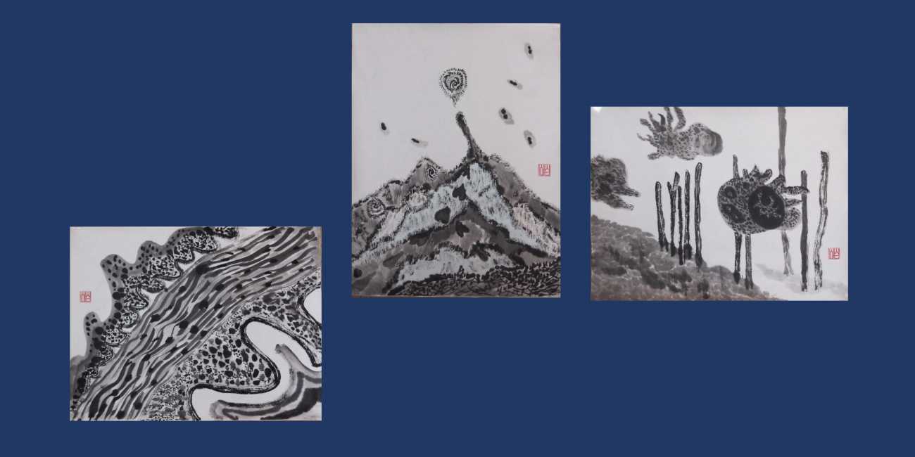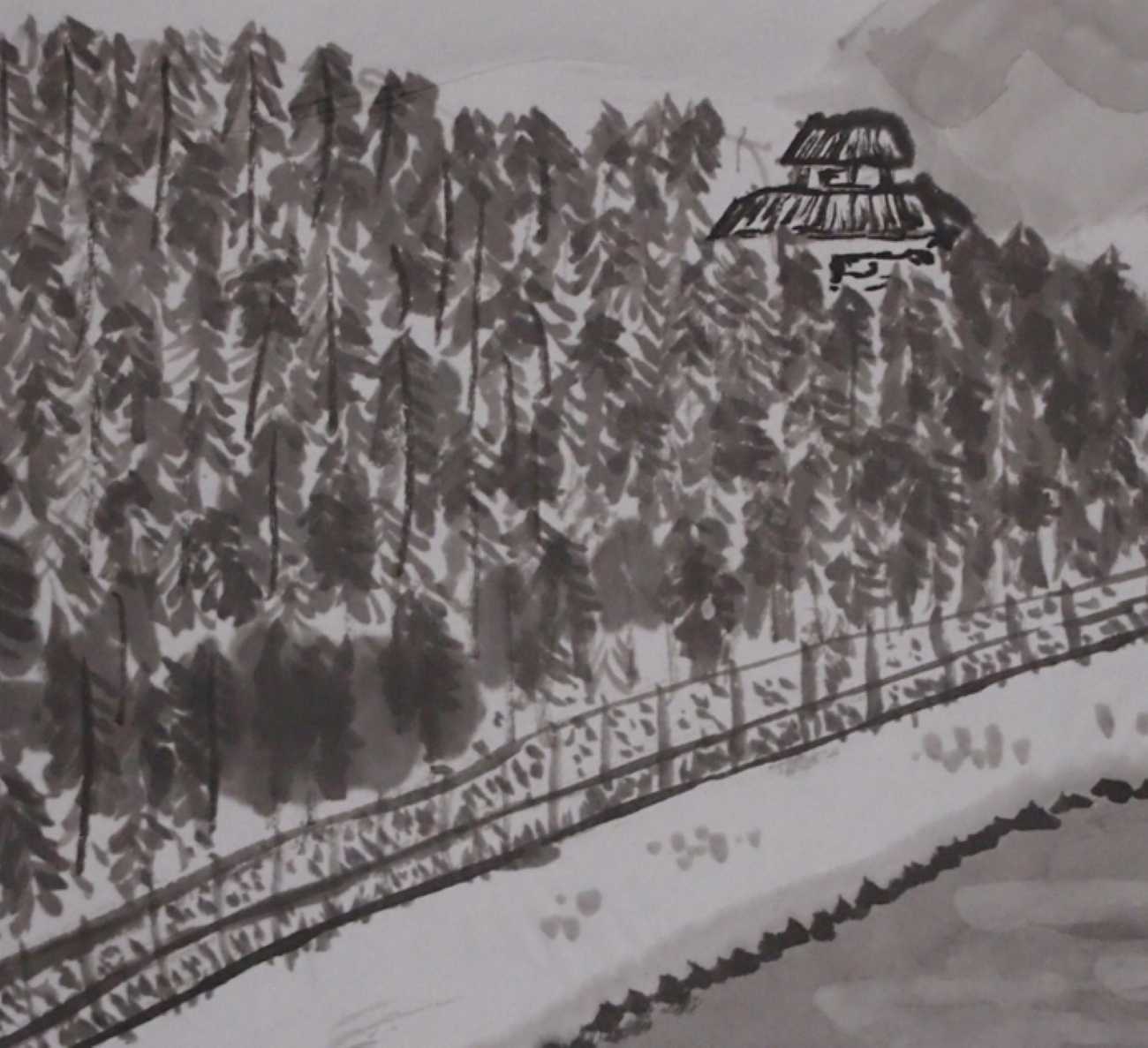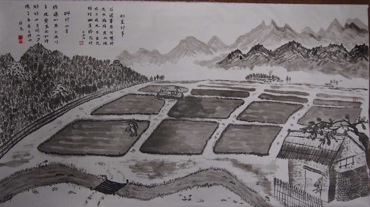 back 美術科 - 書画コース 白山 武司 「初夏山里」 山里の田植え前の情景を描いたもの。初夏の暖かい風が流れ、水田の上から遠景の山に向かって広々とした空間を見渡すゆったりとした気分を表現することを心掛けた。 茶墨(油煙墨)を主体に用いた。水田を流れる風と波打つ水の表現として、ドーサ液で線状の薄い部分を作り、やや太い部分を斜めに並べた。空の雲の動きが光の照り返しの濃淡として映し出されるようにした。川は、ドーサ液と油煙墨でえがいた後、粉末青墨を加えて流れを表した。 「初夏山里」 「初夏山里」部分 ー川の流れと水田ー 「初夏山里」部分 ー林ー 「初夏山里」部分 ー漢詩ー 「生命の息吹」 X Facebook LINE