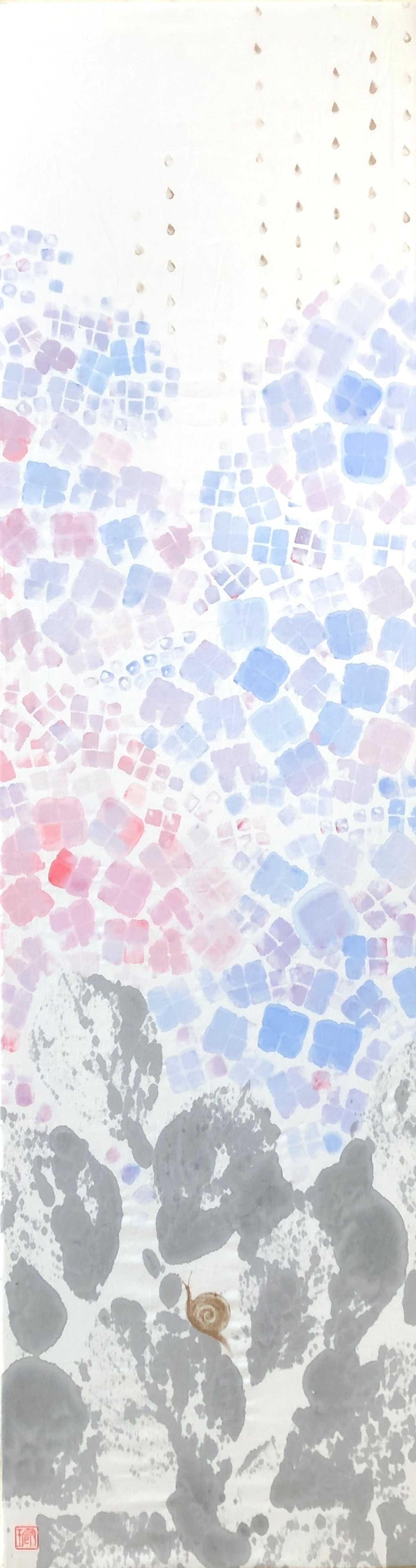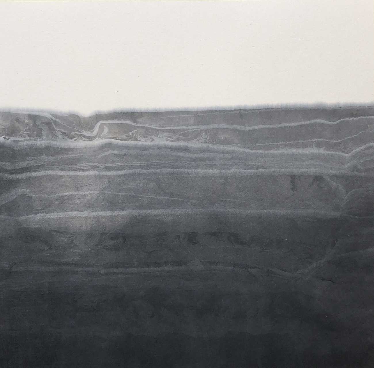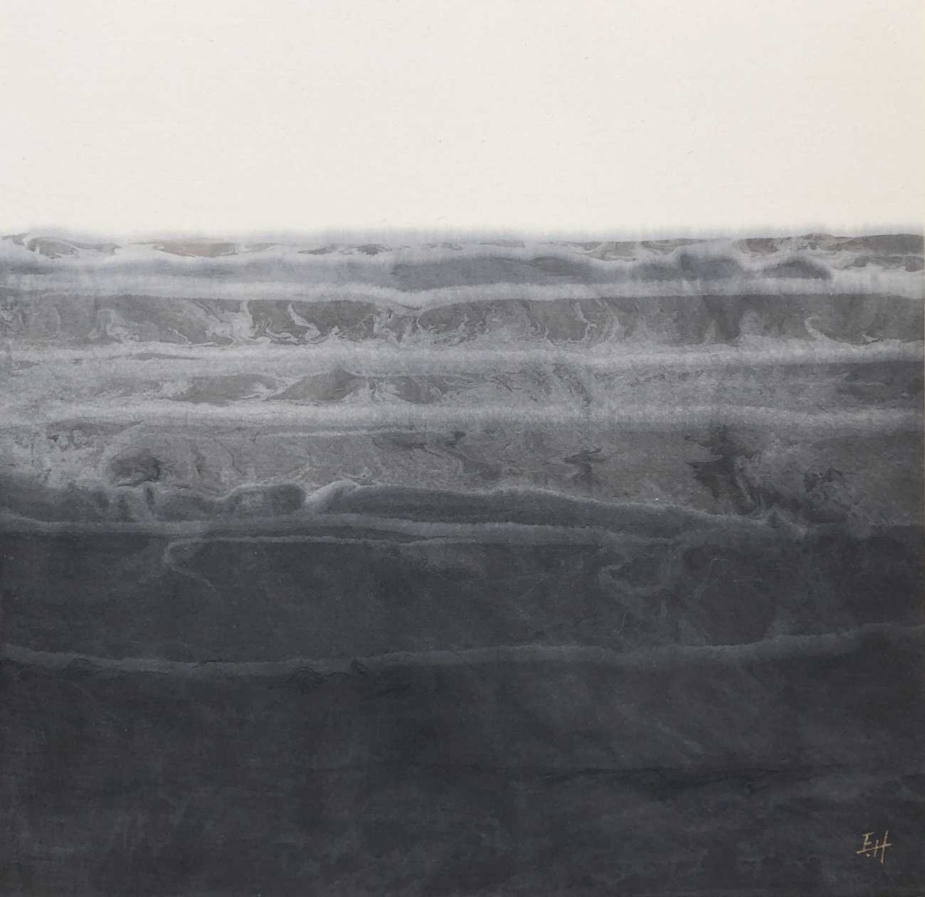 「Imagined Landscape」は心象風景。『心の変化』を広がる波のような抽象で表現。変化を表す波は3作で微妙に異なり、 揺れ動く心を異なる墨の濃淡と泡立つ波のような模様で表現しています。