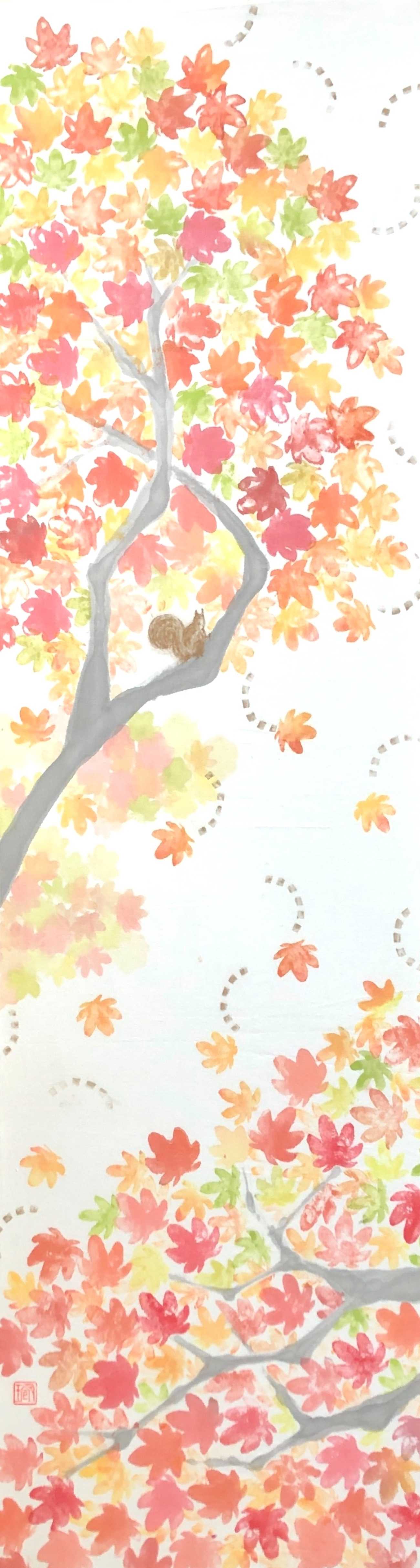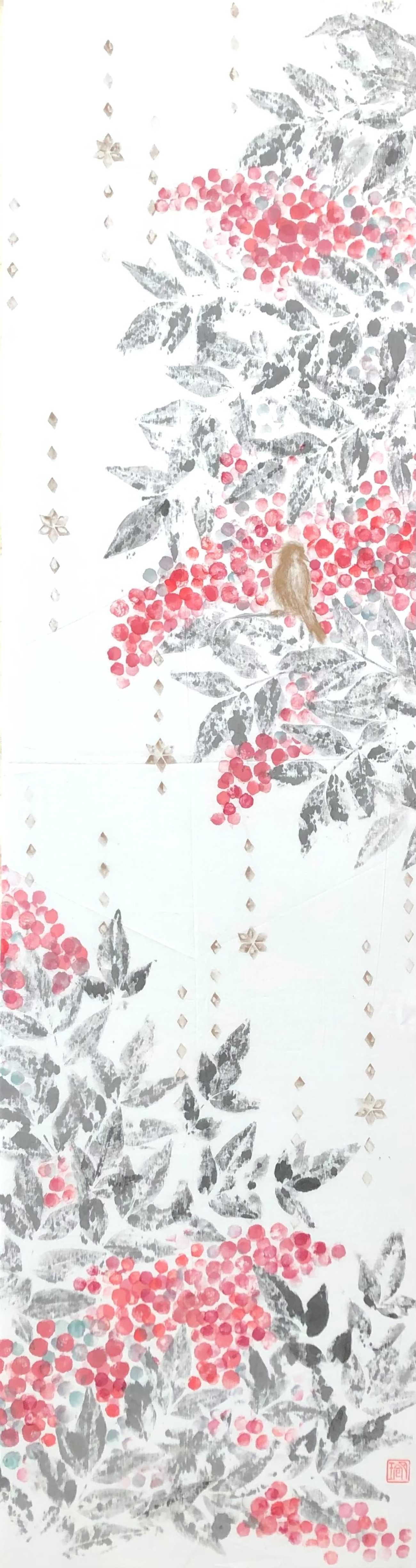 伝統的な構図にそれぞれの季節を表す植物、生き物、雨・風・雪といった自然現象もテキスタイルプリントのようにデザイン化・象形化して表現し、一枚にそれぞれの季節を閉じ込めた《季》のファブリックボードです。