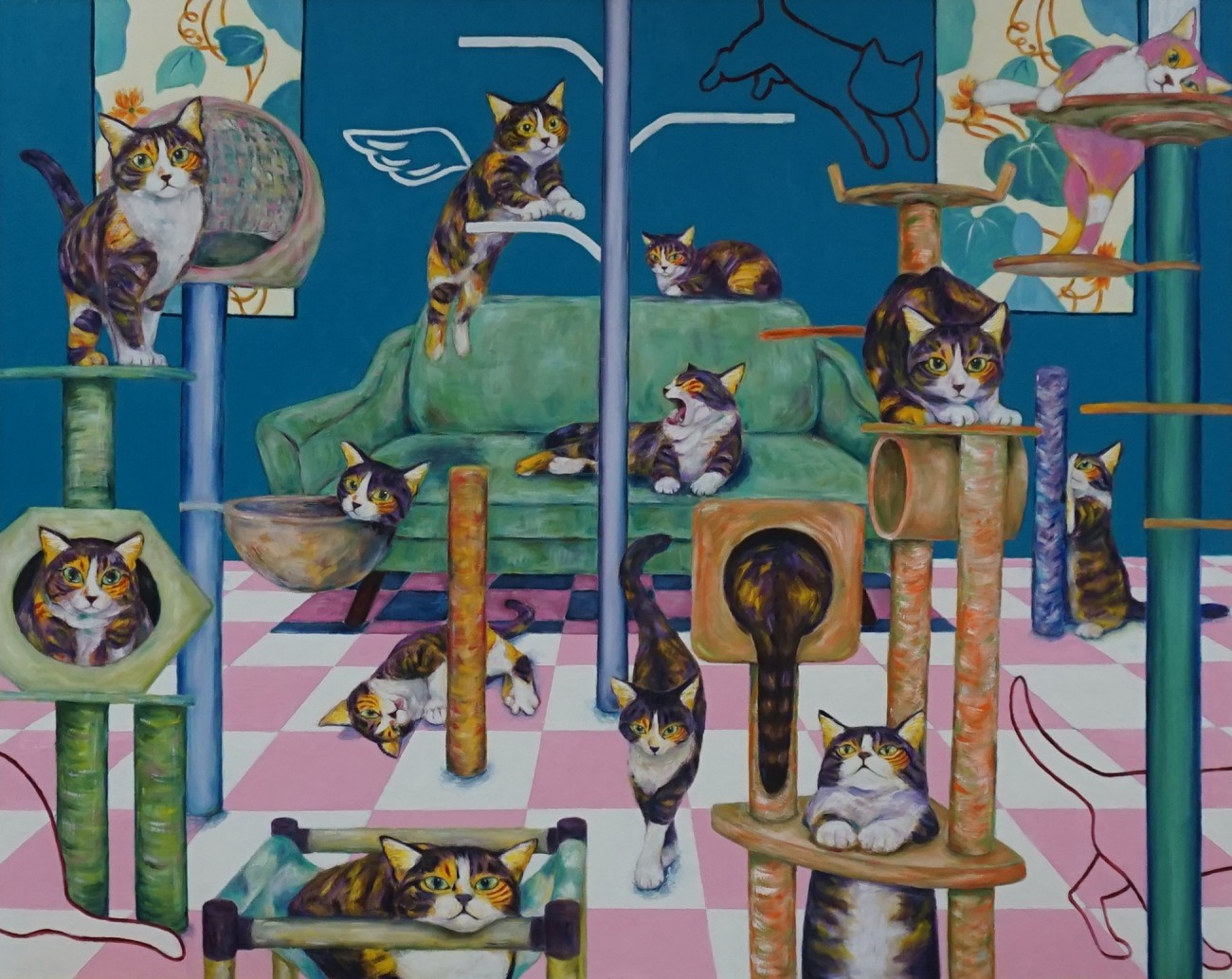 リビングの前に広がるキャットタワーの森で悠々自適に過ごす愛猫を描きました。全て同じ猫です。